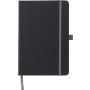 A5 füzet 96 vonalas lappal, könyvjelzővel, gumis zárópánttal. Lézergravírozás után a gravírozott felület színe megegyezik a gumipánt színével. PU anyag. Emblémázás: Tamponnyomás, UV nyomtatás