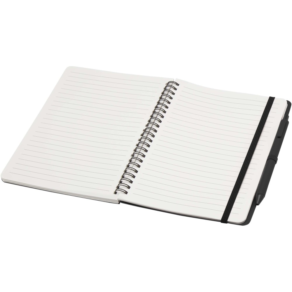 Thalaasa A5 keményfedeles jegyzetfüzet óceánból származó újrahasznosított műanyagból készült, és 80 vonalas, 70 g/m2 krémszínű lapot tartalmaz. A jegyzetfüzet lekerekített sarkokkal, elasztikus zárással és tolltartóval rendelkezik. A fekete tintával író golyóstoll szintén óceánból származó újrahasznosított műanyagból készült. Íráshossz: 1000 méter. Tollhegy mérete: 1,0 mm. Emblémázás: Tamponnyomás