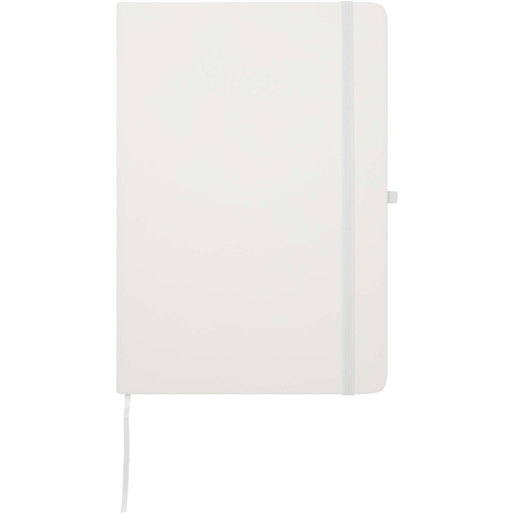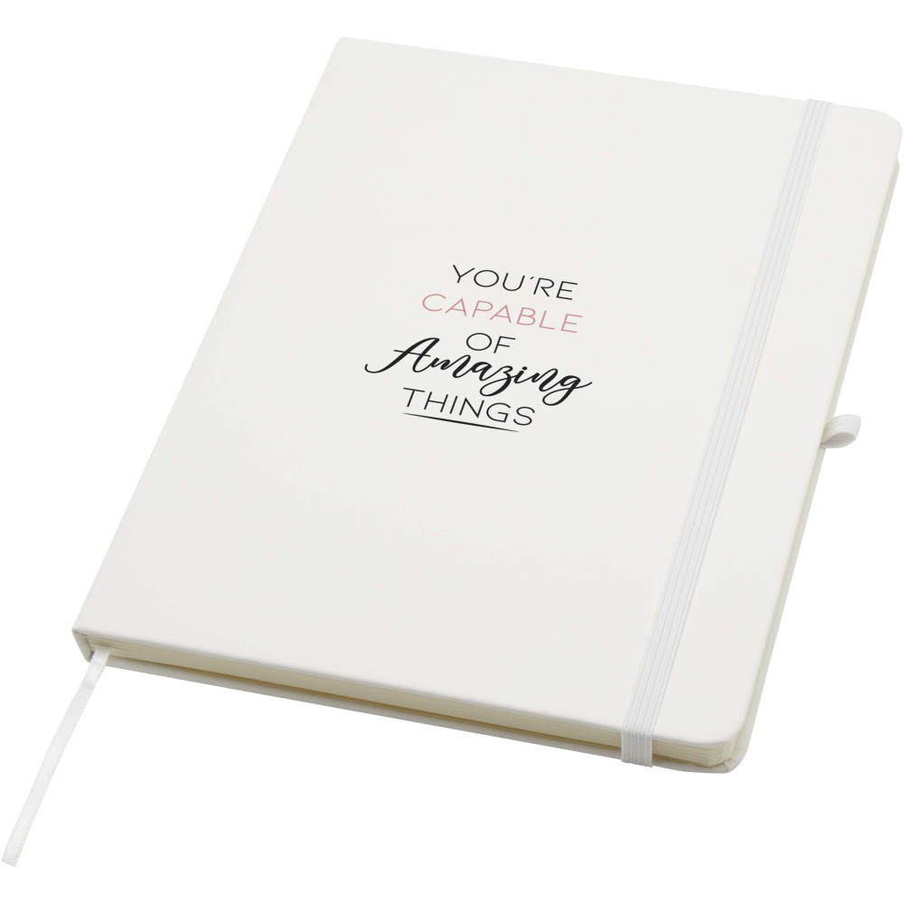 A Spectrum Plus A5 keményfedeles jegyzetfüzet lekerekített sarkokkal nemcsak az irodai mindennapok elengedhetetlen kelléke, hanem remek lehetőség márkád népszerűsítésére is. A jegyzetfüzet puha tapintású borítóval rendelkezik és 80 vonalas, krémszínű, 70 g/m2-es lapból áll, amely tökéletes gyors ötletek vagy hosszabb jegyzetek rögzítésére. A jegyzetfüzet tolltartó hurokkal, gumiszalagos záródással, könyvjelzővel és harmonikazsebbel van ellátva. Emblémázás: Tamponnyomás, UV nyomtatás
