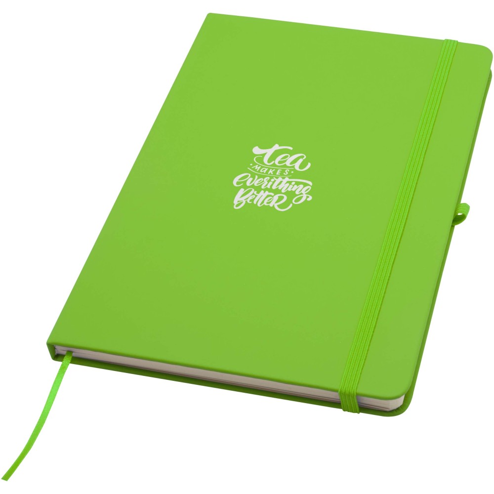 A Spectrum Plus A5 keményfedeles jegyzetfüzet lekerekített sarkokkal nemcsak az irodai mindennapok elengedhetetlen kelléke, hanem remek lehetőség márkád népszerűsítésére is. A jegyzetfüzet puha tapintású borítóval rendelkezik és 80 vonalas, krémszínű, 70 g/m2-es lapból áll, amely tökéletes gyors ötletek vagy hosszabb jegyzetek rögzítésére. A jegyzetfüzet tolltartó hurokkal, gumiszalagos záródással, könyvjelzővel és harmonikazsebbel van ellátva. Emblémázás: Tamponnyomás, UV nyomtatás