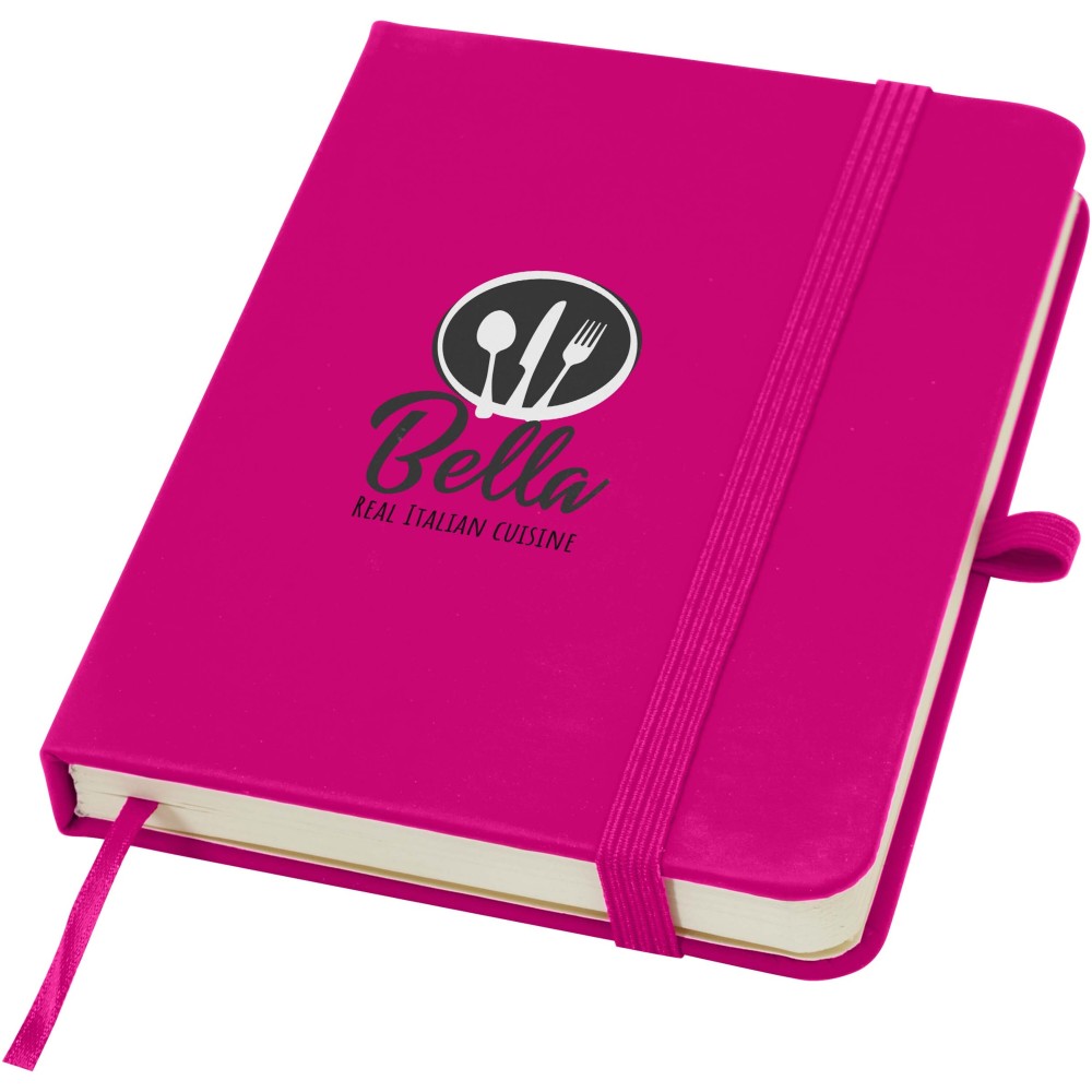 A Spectrum Plus A6 keményfedeles jegyzetfüzet lekerekített sarkokkal nemcsak az irodai mindennapok elengedhetetlen kelléke, hanem remek lehetőség márkád népszerűsítésére is. A jegyzetfüzet puha tapintású borítóval rendelkezik és 80 vonalas, krémszínű, 70 g/m2-es lapból áll, amely tökéletes gyors ötletek vagy hosszabb jegyzetek rögzítésére. A jegyzetfüzet tolltartó hurokkal, gumiszalagos záródással, könyvjelzővel és harmonikazsebbel van ellátva. Emblémázás: Tamponnyomás