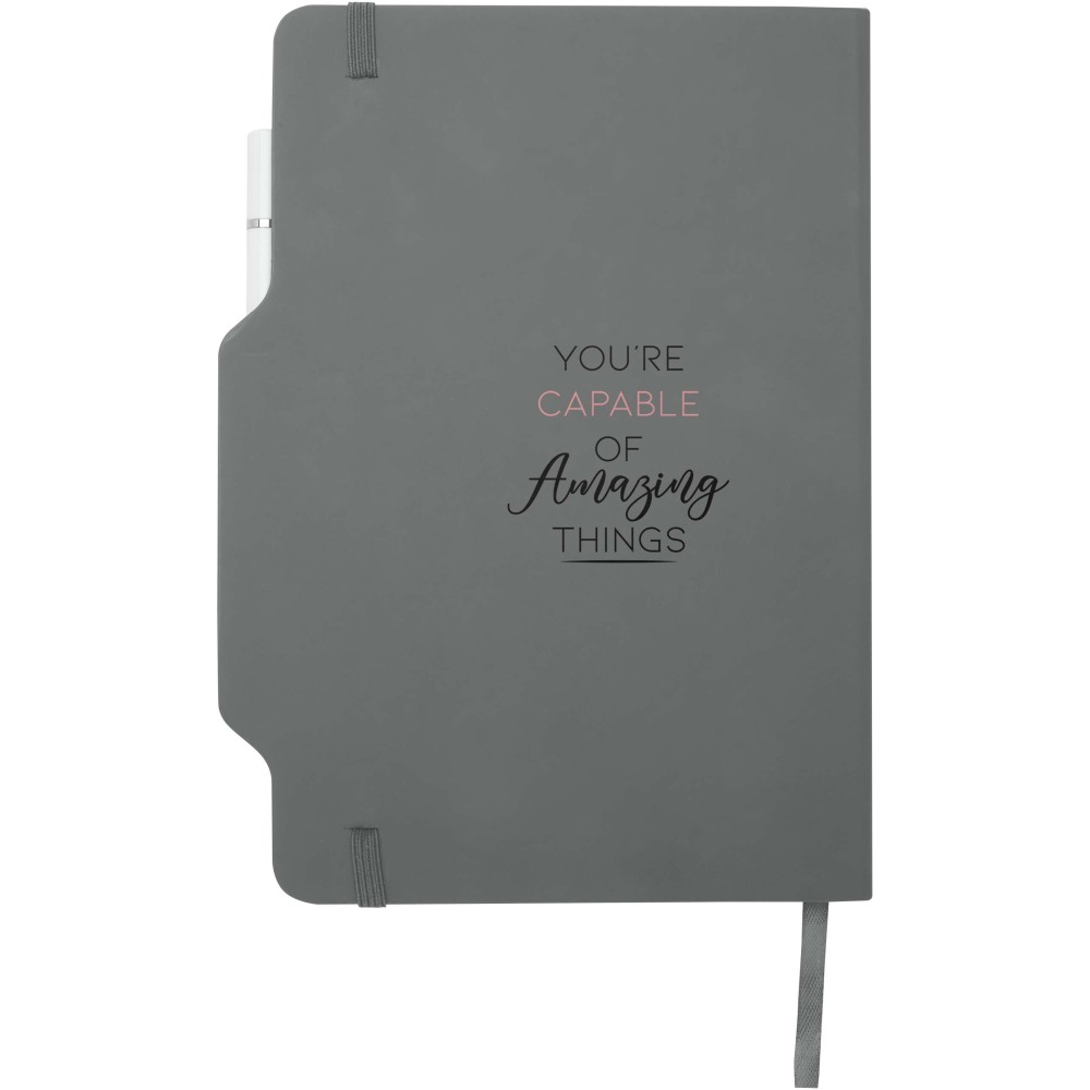 A Nexus A5 keményfedeles jegyzetfüzet egy toll/ceruza kombinációval praktikus és stílusos választás. 80 krém színű, 70 g/m2 vonalas lapot tartalmaz, lekerekített sarkokkal, rugalmas zárópánttal és szalagkönyvjelzővel. A kétvégű toll egyik oldala fekete tintával író golyóstoll, a másik oldala ceruza. A toll íráshossza: 1000 méter. Tollhegy mérete: 1,00 mm. Emblémázás: Tamponnyomás