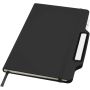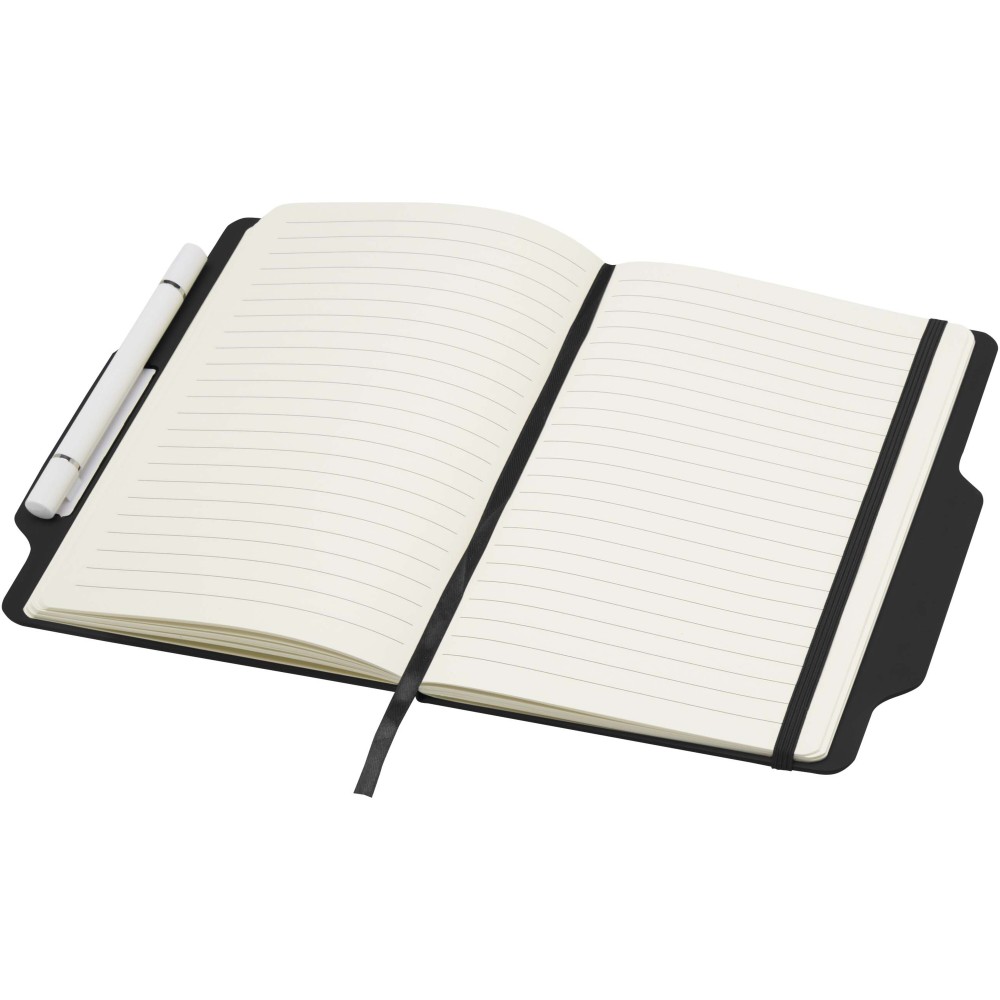 A Nexus A5 keményfedeles jegyzetfüzet egy toll/ceruza kombinációval praktikus és stílusos választás. 80 krém színű, 70 g/m2 vonalas lapot tartalmaz, lekerekített sarkokkal, rugalmas zárópánttal és szalagkönyvjelzővel. A kétvégű toll egyik oldala fekete tintával író golyóstoll, a másik oldala ceruza. A toll íráshossza: 1000 méter. Tollhegy mérete: 1,00 mm. Emblémázás: Tamponnyomás