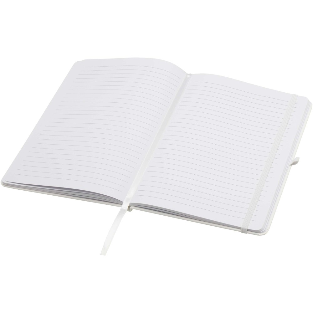 A Teak A5 méretű, újrahasznosított karton keménytáblás jegyzetfüzet lekerekített sarkokkal nemcsak irodai alapdarab, hanem kiváló lehetőség a márka népszerűsítésére is. A jegyzetfüzet 96 darab 70 g/m2-es vonalas lapot tartalmaz és puha tapintású borítóval rendelkezik. Beépített tolltartó hurokkal, rugalmas zárópánttal és könyvjelzővel van ellátva. Emblémázás: Tamponnyomás, UV nyomtatás