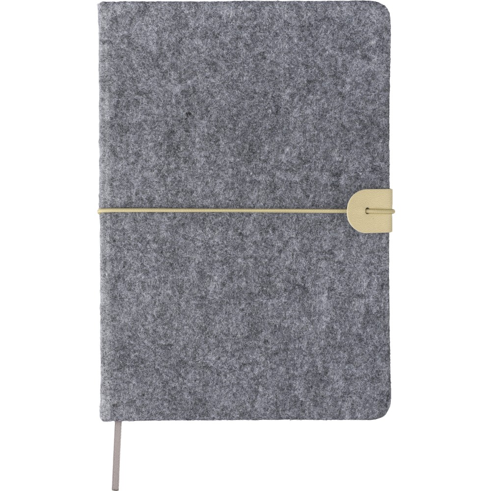 Újrahasznosított filcből készült jegyzetfüzet, kb. A5-ös méretű, 80 lapos. Puha tapintású kemény borítóval, gumiszalaggal és kívül PU zárópánttal. Szalagos könyvjelzővel és 70 g/m2-es vonalas papírral. A hátoldalán lézergravírozott újrahasznosított logóval. Emblémázás: Szitanyomás