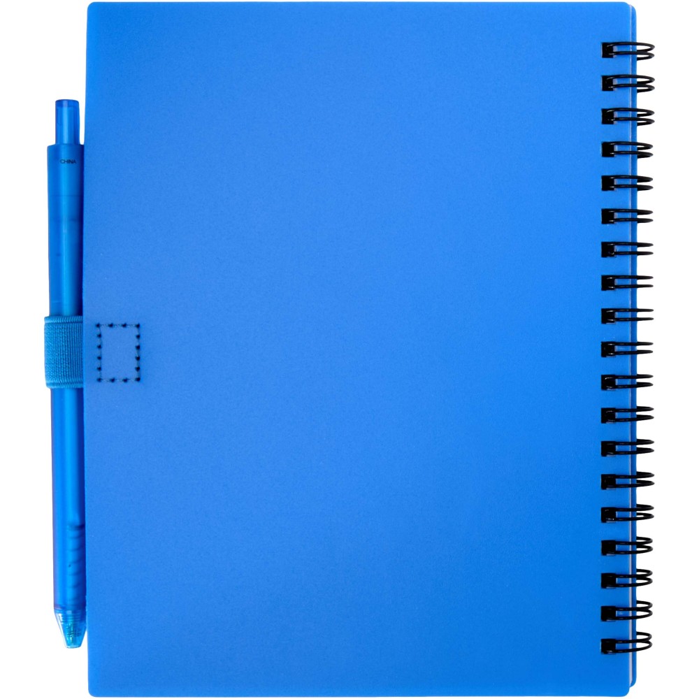 A Niove puhafedeles jegyzetfüzet újrahasznosított műanyagból készült, 70 darab, pontozott, 70 g/m2 papírlappal. A jegyzetfüzet sarkai lekerekítettek, és tolltartóhurokkal rendelkezik. Mérete: 140 × 178 mm. A golyóstoll szintén újrahasznosított műanyagból készült. Tollbetét színe: kék. Íráshossz: 1000 méter. Hegyméret: 1,0 mm. Emblémázás: Szitanyomás, Tamponnyomás