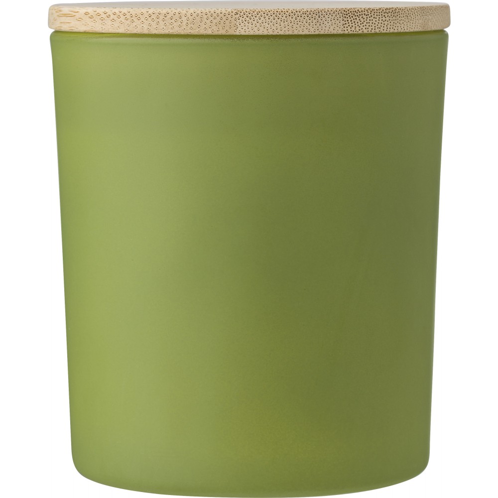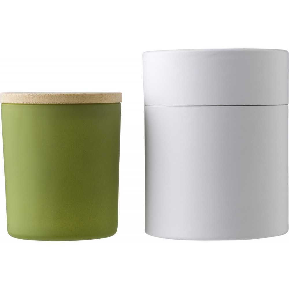 Üveggyertya növényi alapú viasszal és bambusz fedővel. A gyertya főleg növényi alapú viaszt (karnaubaviaszt) tartalmaz, égési ideje körülbelül 46 óra. Négy illat az üveg színétől függően: fahéj (piros), vanília (fehér), szantálfa (fekete) és jázmin (zöld). Egyenként, fehér papírpalástba csomagolva. Emblémázás: Gravírozás, UV nyomtatás