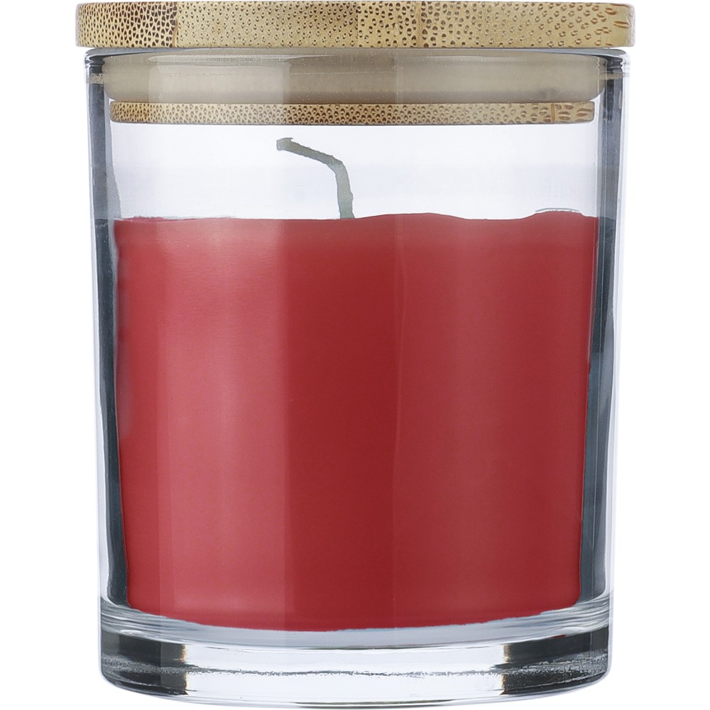Üveg gyertyatartó 120 g vanília illatú, színes viasszal és bambusz fedéllel. Kb. 20 óra égési idővel. Csomagolása fehér papírhenger. Emblémázás: Gravírozás, Tamponnyomás