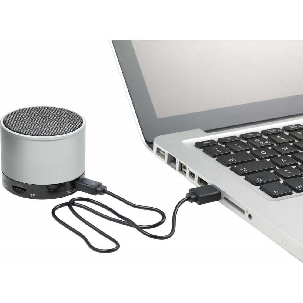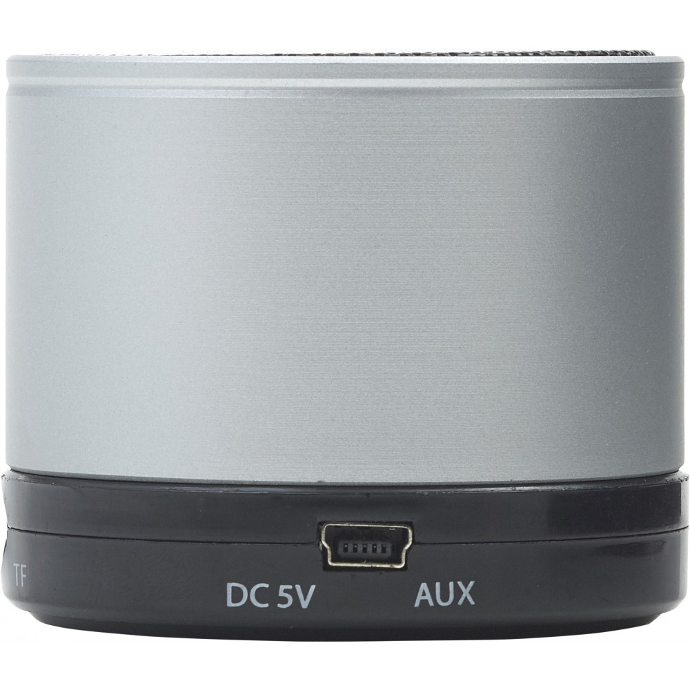 Vezeték nélküli hangszóró hangerő szabályozóval, előre- és visszaléptető gombbal, valamint módválasztó gombbal: MP3, vezeték nélküli mód és kikapcsolás. A töltőkábelt tartalmazza. Színezett fém anyag. Emblémázás: Tamponnyomás, UV nyomtatás
