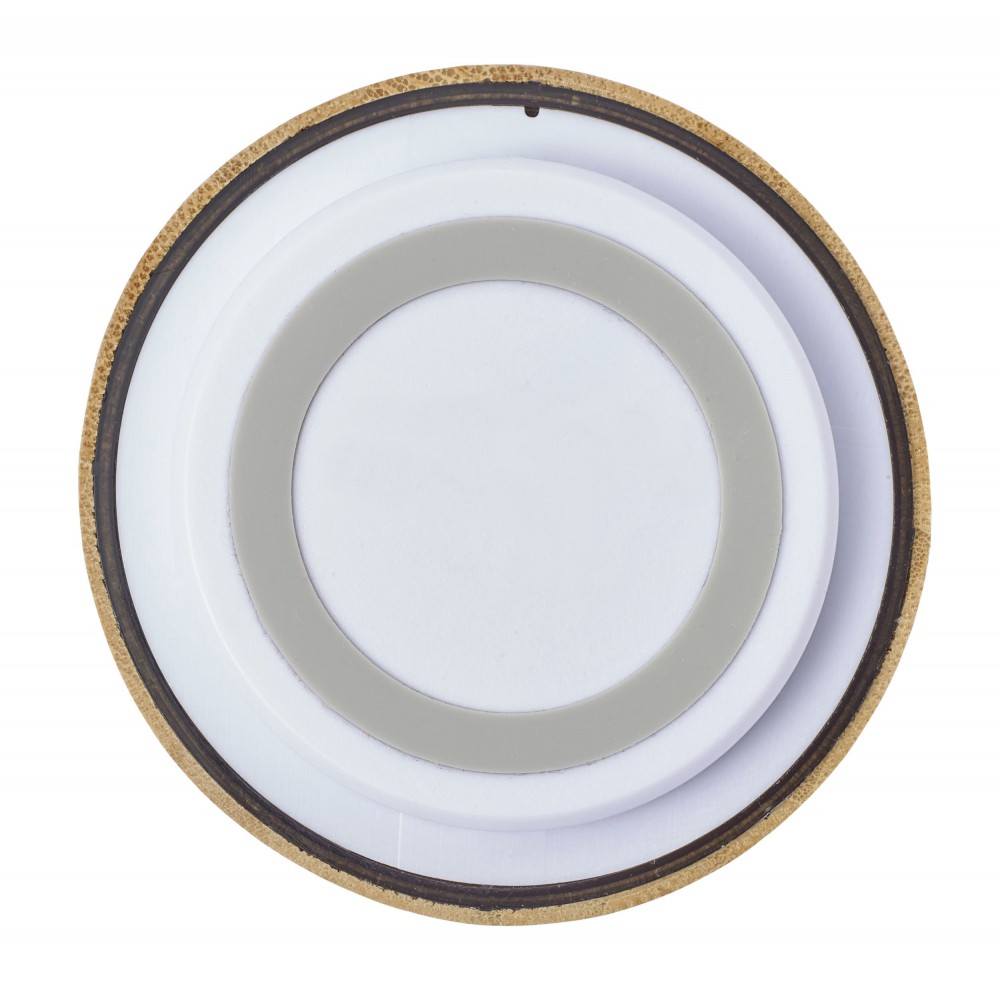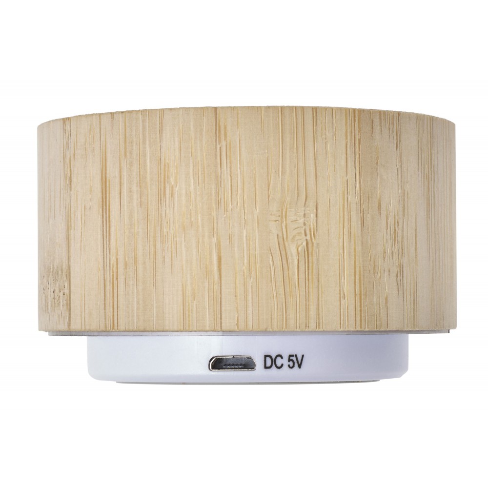 Vezeték nélküli hangszóró változó fénnyel, 3W teljesítménnyel, tölthető, 3 mAh-es li-ion akkumulátorral. Játszási idő egy töltéssel kb. 3 óra. A vezetéket tartalmazza. Csomagolása fehér doboz. Bambusz. Emblémázás: Gravírozás, Tamponnyomás, UV nyomtatás