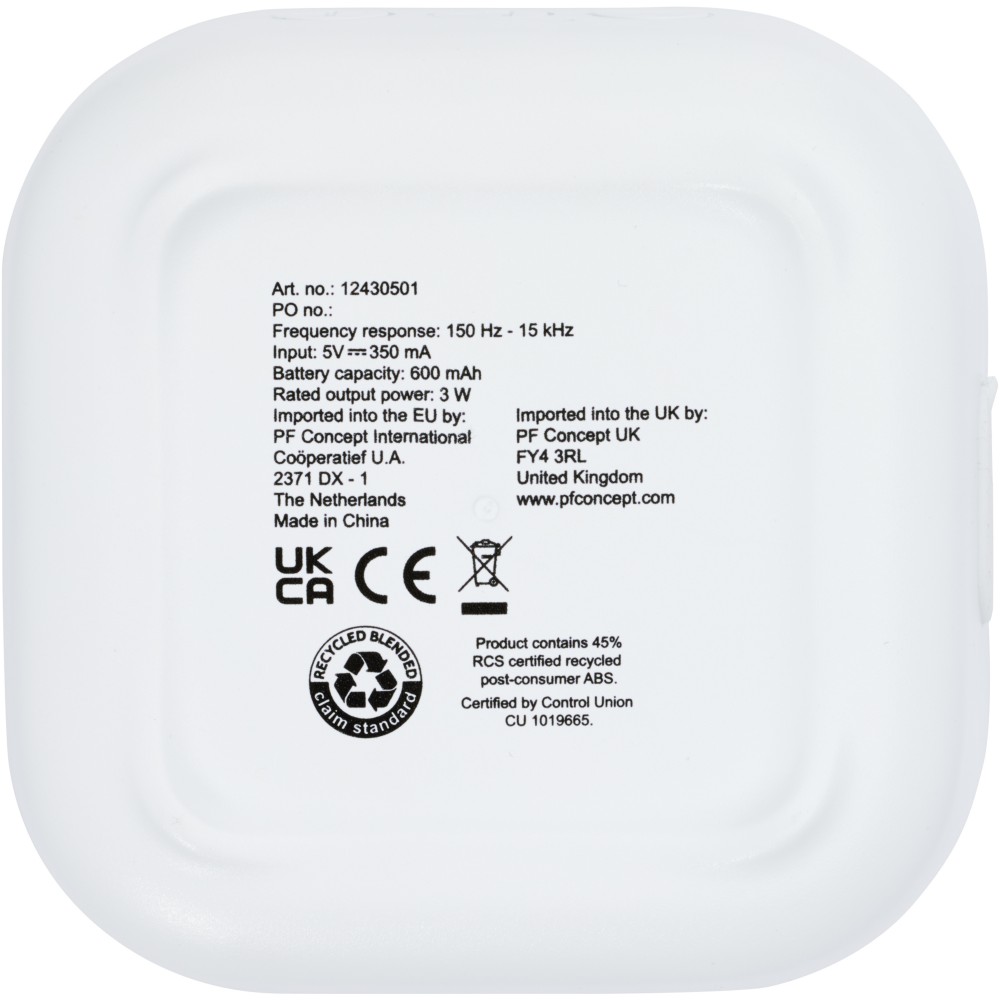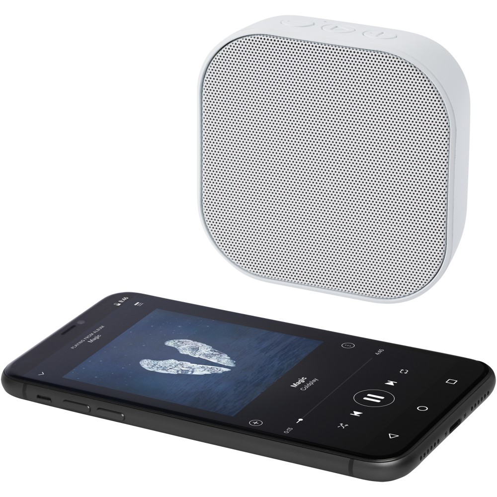 RCS újrahasznosított 3W-os Bluetooth hangszóró, amely zenét, podcastokat, stb. játszik le bármely Bluetooth kompatibilis eszközéről, így ideális társ minden alkalomhoz. A hangszóró beépített vezérlőkkel és mikrofonnal rendelkezik. Élvezze zenéit akár 3-4 órán keresztül maximális hangerőn. A töltési idő 3 óra. Bluetooth 5.3 körülbelül 10 méteres működési hatótávolsággal. Használati útmutatóval, 30 cm-es USB-A-C típusú töltőkábellel és fenntartható forrásból származó, 100%-ban újrahasznosított kartondobozba csomagolva szállítjuk. Újrahasznosított ABS műanyag. Csomagolás: FSC Recycled 100% P5.1 CU-COC-877277. Emblémázás: UV nyomtatás