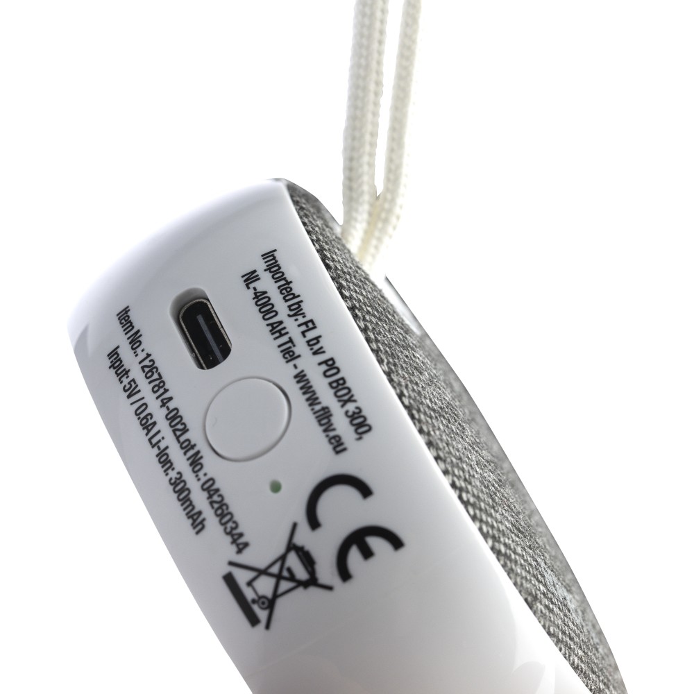 Újrahasznosított ABS és rPET anyagból készült vezeték nélküli hangszóró vékony nejlon hordozópánttal. 3 W teljesítmény, 300 mAh akkumulátor, 5.3-as vezeték nélküli technológia és 10 méteres hatótávolság. 30 cm-es fehér USB-C töltőkábellel. Az anyagon rPET logóval, az oldalán pedig újrahasznosított ABS logóval. Egyenként csomagolva, barna kartondobozban. Emblémázás: Tamponnyomás