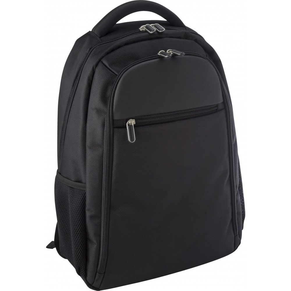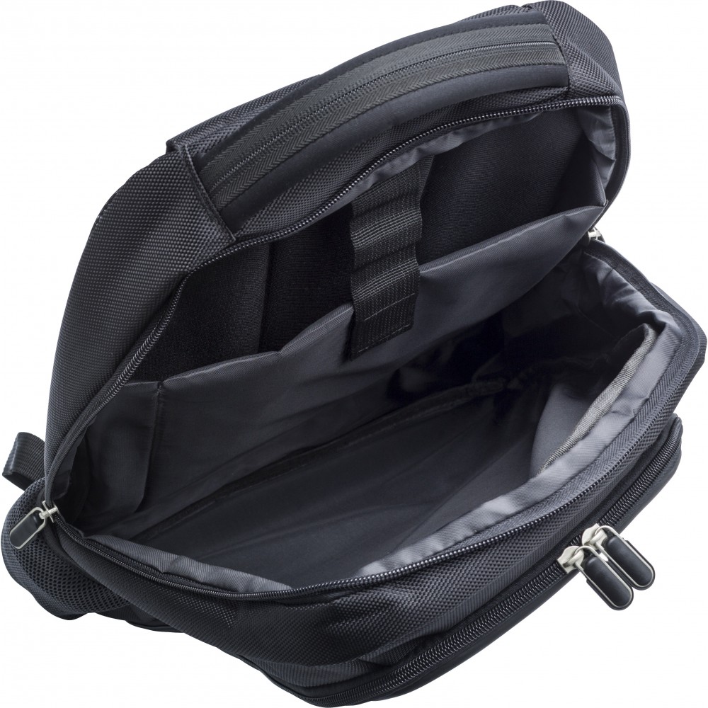 Laptophátizsák. Egy nagy párnázott rész, egy kisebb, cipzáros elsőzseb, két oldalzseb, állítható, párnázott vállpántok. 1680D poliészter. Emblémázás: Szitanyomás