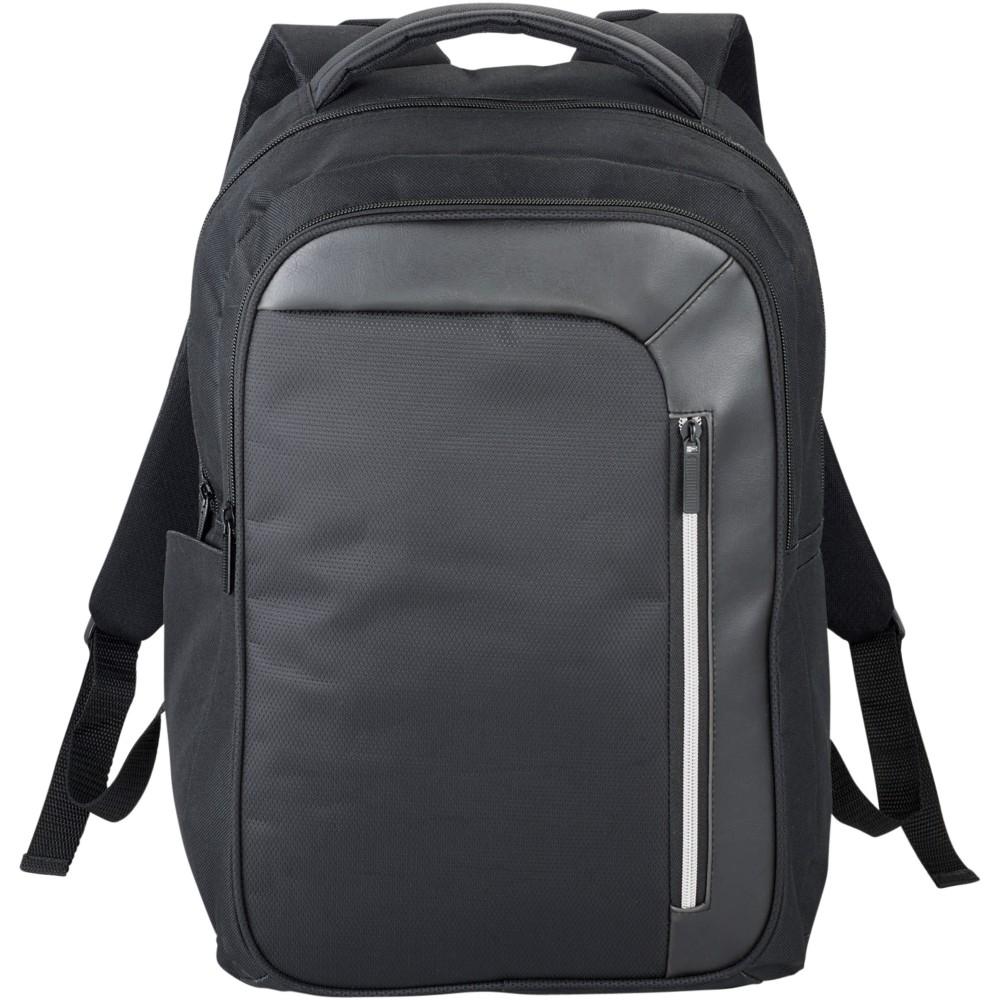 Elegáns, trendi, 15,6 -es laptop hátizsák nagy cipzáras, kulcstartós első zsebbel és rejtett RFID technológiájú blokkoló zsebbel a kártyák és okmányok adatlopás elleni védelme érdekében. A nagy, cipzáras fő tárolórész 15,6 -es laptop tárolására alkalmas, és elkölönített, párnázott résszel rendelkezik iPad vagy tablet számára. Az első, függőleges cipzár nyújt hozzáférést az első zsebhez. Két kiegészítő oldalzseb további tárolási lehetőséget biztosít, a párnázott, állítható vállpántok kényelmes viseletet nyújtanak, a hordozófül és a gurulós bőröndre húzható zseb lehetővé teszi a könnyű hordozást. Emblémázás: Szitanyomás