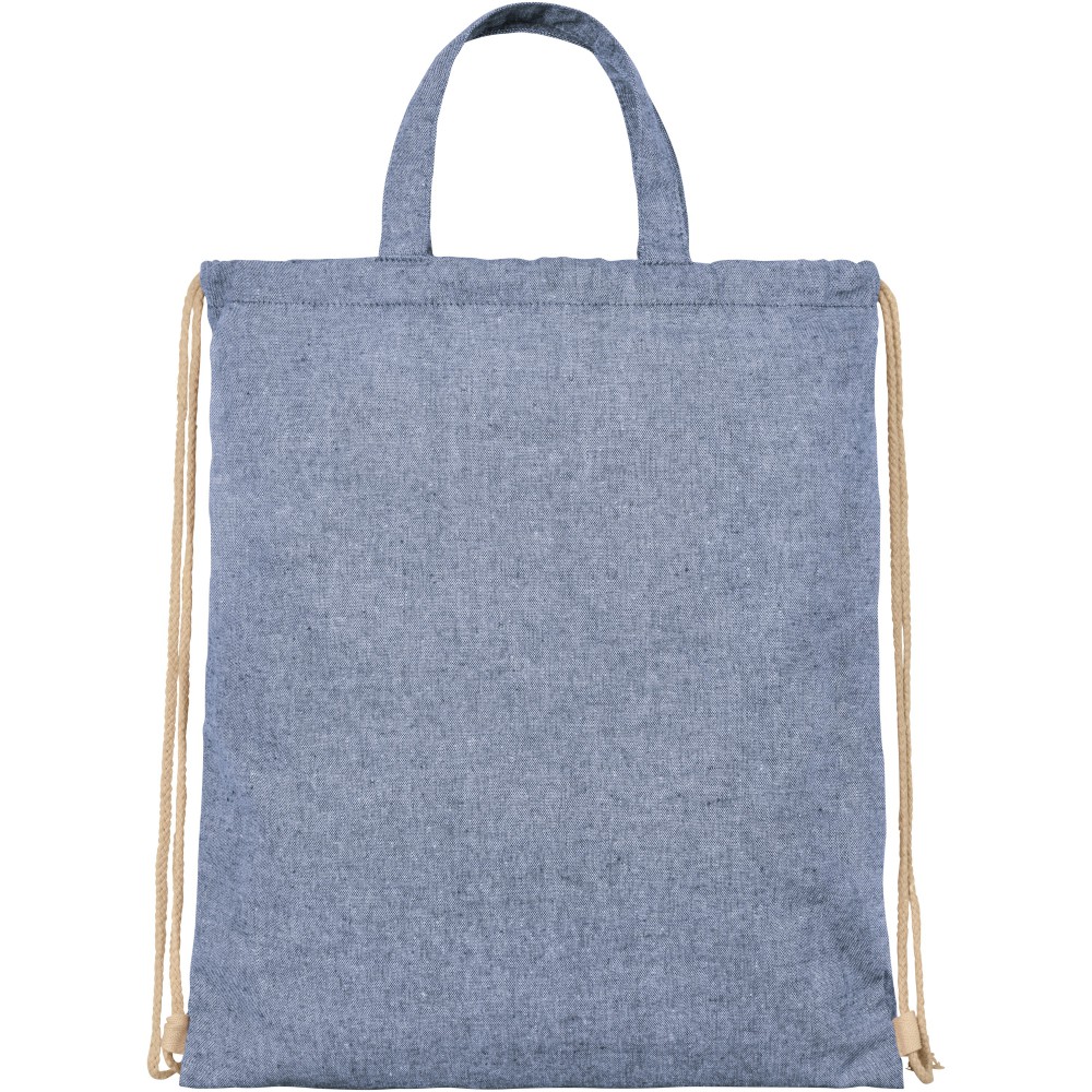 Tornazsák 210 g / m2 újrahasznosított pamut poliészter keverékből. Az újrahasznosított pamut textilipari szabászati hulladékból ered. Az újrahasznosított anyag természetéből fakadóan kisebb eltérések lehetnek a színben. Fülmagasság 14 cm. Teherbírás 5 kg-ig. Újrahasznosított pamut, 210 g/m2, újrahasznosított poliészter. Emblémázás: Szitanyomás
