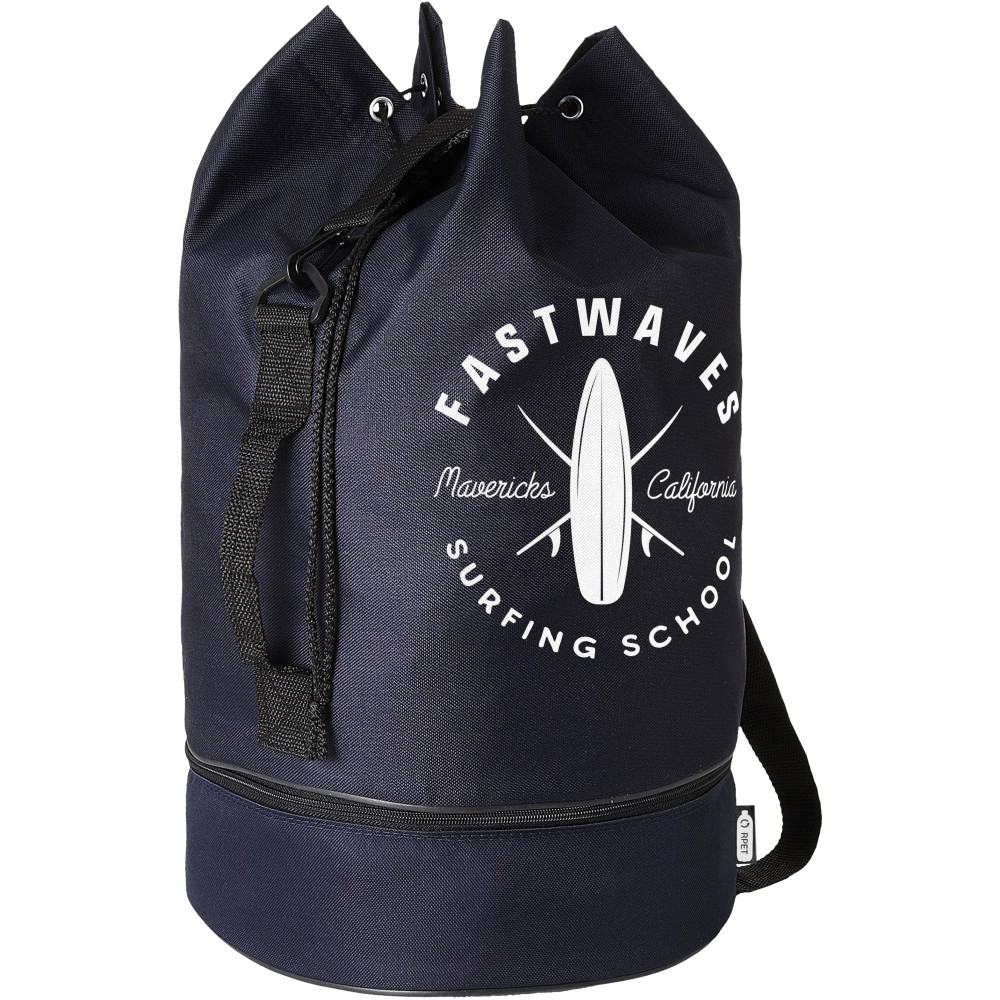 Vízálló tengerészzsák újrahasznosított PET műanyagból, tágas, 20 literes fő rekesszel, húzózsinórral, oldalfogantyúval és állítható vállpánttal. Külön cipzáras alsó rekesszel is rendelkezik a kisebb tárgyak számára. Emblémázás: Szitanyomás