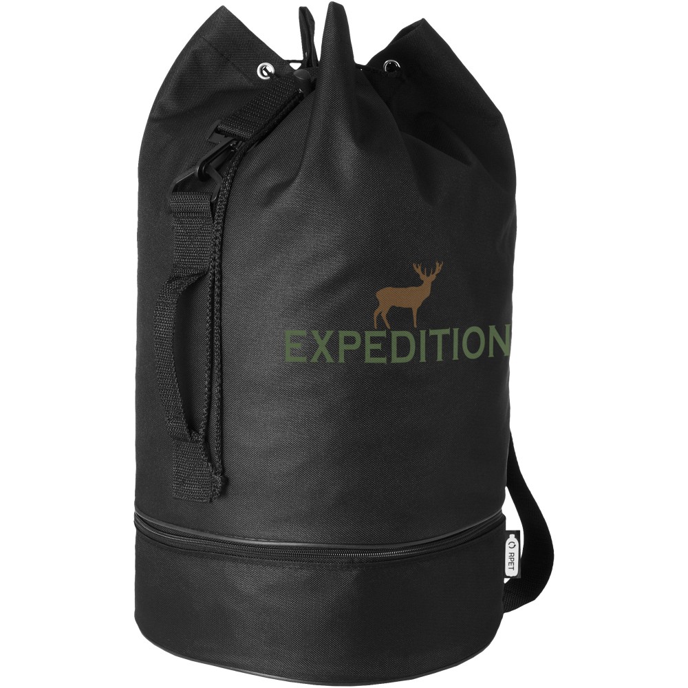 Vízálló tengerészzsák újrahasznosított PET műanyagból, tágas, 20 literes fő rekesszel, húzózsinórral, oldalfogantyúval és állítható vállpánttal. Külön cipzáras alsó rekesszel is rendelkezik a kisebb tárgyak számára. Emblémázás: Szitanyomás