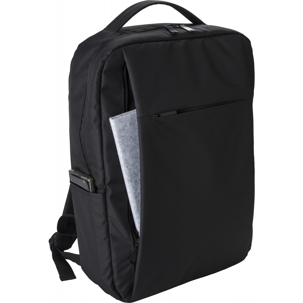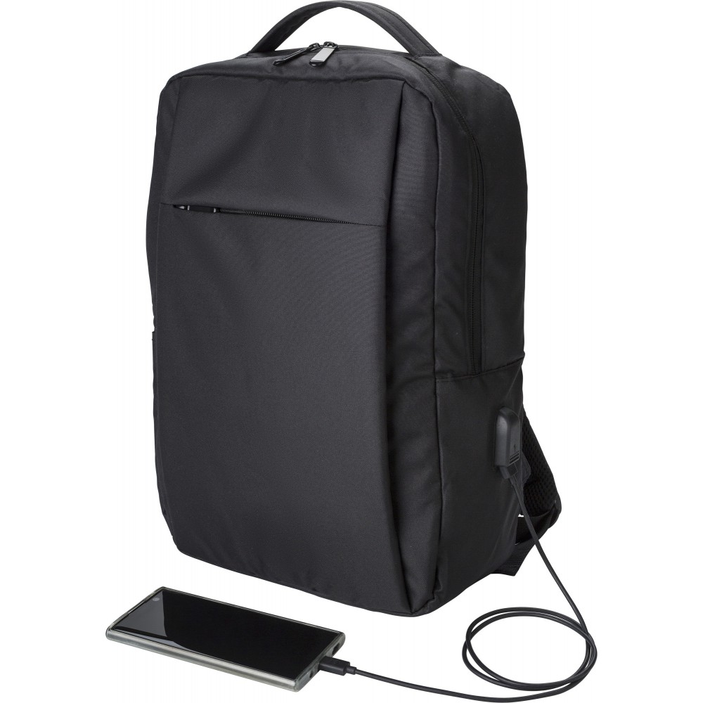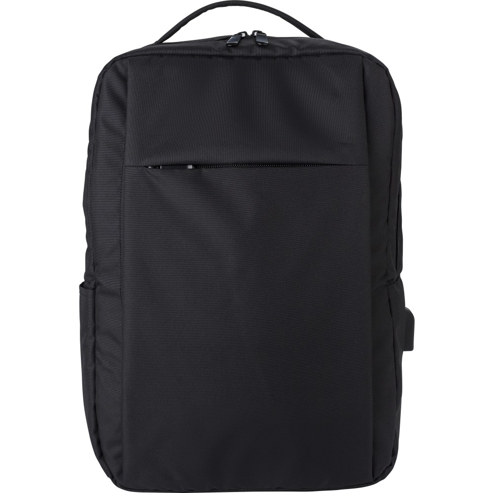 Laptophátizsák 16"-es laptop számára. Belül több zsebbel, laptoptartó rész tépőzárral, egy elülső cipzáras zsebbel. Oldalt USB-A kimenet. RPET 300D és 210D anyag. Emblémázás: Szitanyomás