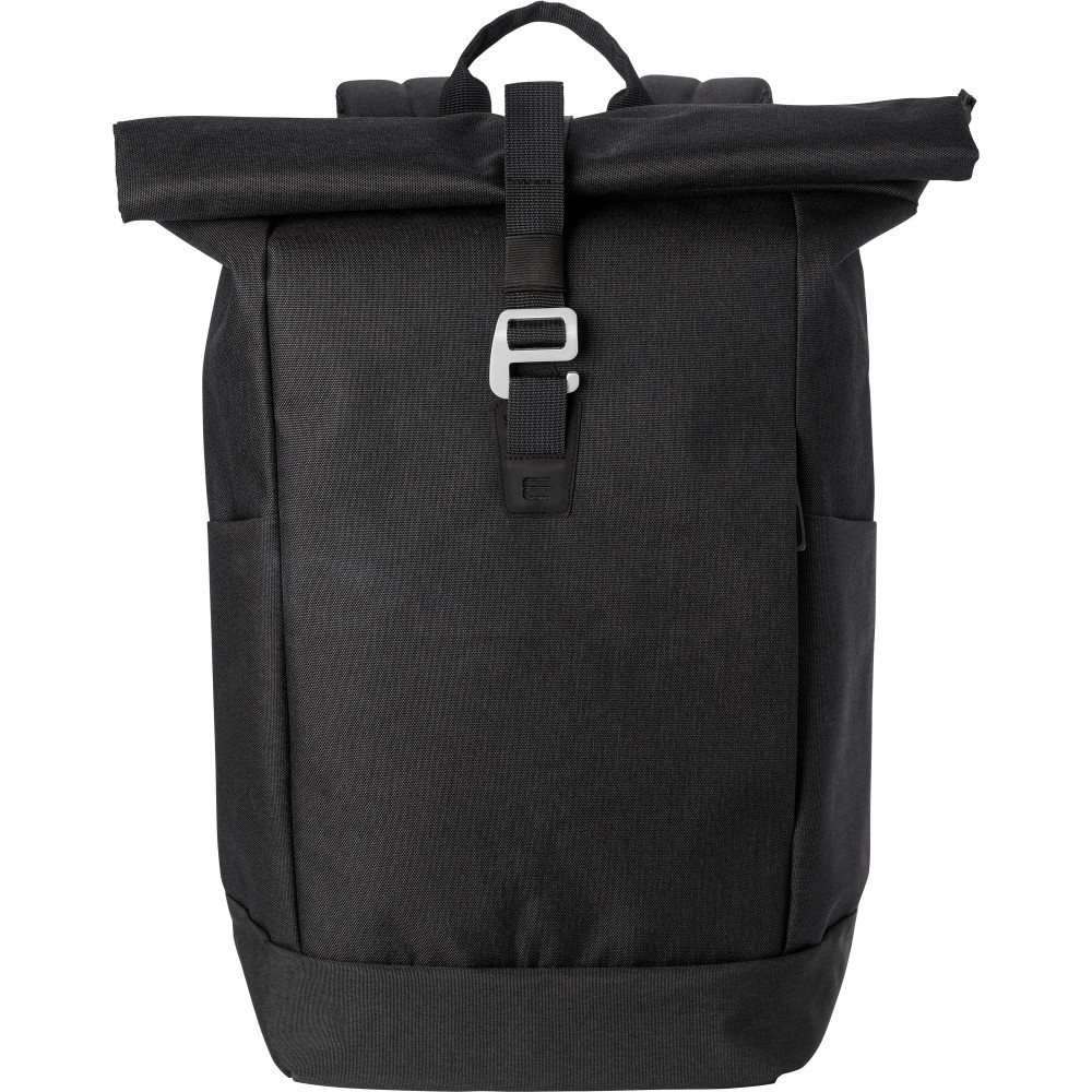 Poliészter (600D) rolltop hátizsák. Egy nagy cipzáras rekesz két csúszózsebbel és egy laptop rekesszel. Cipzáras rekesz elöl. Párnázott hátoldal és pántok. Fémhorog a záráshoz. Emblémázás: Szitanyomás