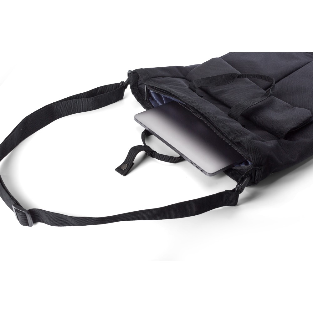 Poliészter (900D) válltáska. Két tépőzáras zseb az elülső oldalon, egy nagy cipzáras rekesz a tetején és egy cipzáras rekesz a hátoldalon. Több rekesz belül, köztük egy laptop rekesz (15 colos). A táska állítható pántokkal és rövid fogóval rendelkezik. Emblémázás: Szitanyomás