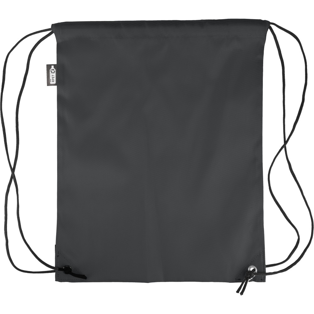 Tornazsák 210D poliészter anyagból, fekete PU sarokerősítéssel az elején, és belső varrással. Fekete nylon húzózsinórral, egy rekesszel. Űrtartalom: 5 liter, teherbíró képesség: 7 kg. rPET címkét tartalmaz. Emblémázás: Szitanyomás