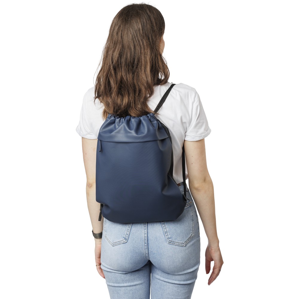 600D rPET poliészter tornazsák. Az elejét PU bevonat teszi vízlepergetővé. Rejtett cipzáras első zsebbel, két tárolórésszel, első és belső zsebekkel. Kapacitása 8 liter, teherbírása 8 kg. Oldalán rPET címkével. Emblémázás: Szitanyomás