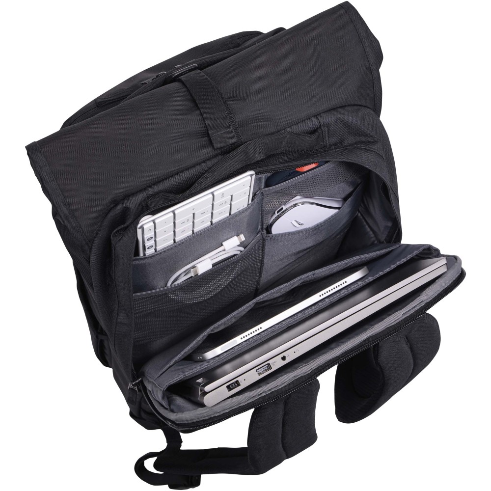 A Case Logic Variate 17" laptop hátizsák elegáns és sokoldalú társ munkához, utazáshoz és mindennapi használathoz. Rolltop kialakítása 28 literről 33 literre bővíthető, így rugalmas tárolási lehetőséget kínál modern megjelenéssel. Anyaga 85%-ban újrahasznosított, beleértve a 100% újrahasznosított poliészter külsőt, bélést és hálót, amelyet PFAS-mentes, tartós vízlepergető bevonattal láttak el. Belső részében külön rekesz található 17"-os laptop számára, valamint hely biztosított tabletnek, billentyűzetnek, egérnek és egyéb kiegészítőknek. A kivehető rendszerező tasak segít a kisebb kellékek átlátható tárolásában, amely könnyedén mozgatható otthon és iroda között. Külső oldalán két bővíthető zseb kínál gyors hozzáférést kulacshoz vagy esernyőhöz. A mindennapi kényelem érdekében párnázott, légáteresztő hátlappal és vállpántokkal, valamint bőröndhöz rögzíthető pánttal rendelkezik. Emblémázás: Szitanyomás