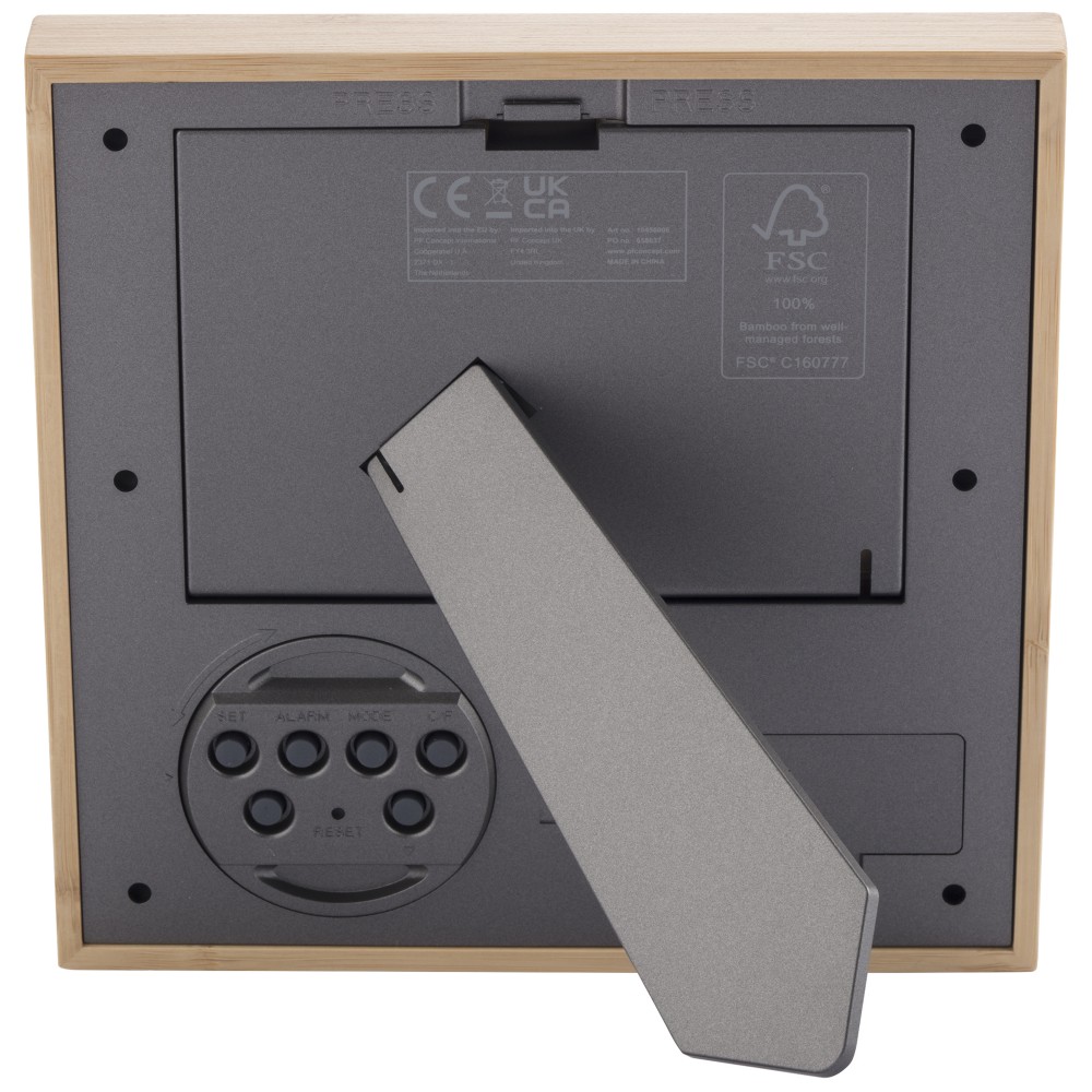 A Sasa bambusz képkeret időjárás állomással stílusos és funkcionális dekorációt nyújt otthonának vagy irodájának. A felelősen beszerzett bambusz házának és az újrahasznosított műanyagból készült hátsó toknak köszönhetően ez a képkeret természetes eleganciát sugároz, miközben elősegíti a fenntarthatóságot. A szilikon gombok kényelmes és érzékeny felhasználói élményt, az LCD-üveg pedig tiszta és éles megjelenítést biztosít. Ez a képkeret számos hasznos funkciót is kínál. Normál módban megjeleníti az időt, hónapot, dátumot, a hét napját és a hőmérsékletet. Ébresztő/szundi funkcióval is rendelkezik, hogy időben kezdje a napot. A születésnapi emlékeztető mód lehetővé teszi a fontos dátumok nyomon követését, míg az időzítő mód tökéletes a feladatok vagy tevékenységek időzítésére. Ezenkívül a zeneértékelési mód akár 7 választható dal közül is választhat. 2 db AA elemet tartalmaz. Nátronpapír díszdobozban szállítjuk. Emblémázás: Gravírozás, Tamponnyomás