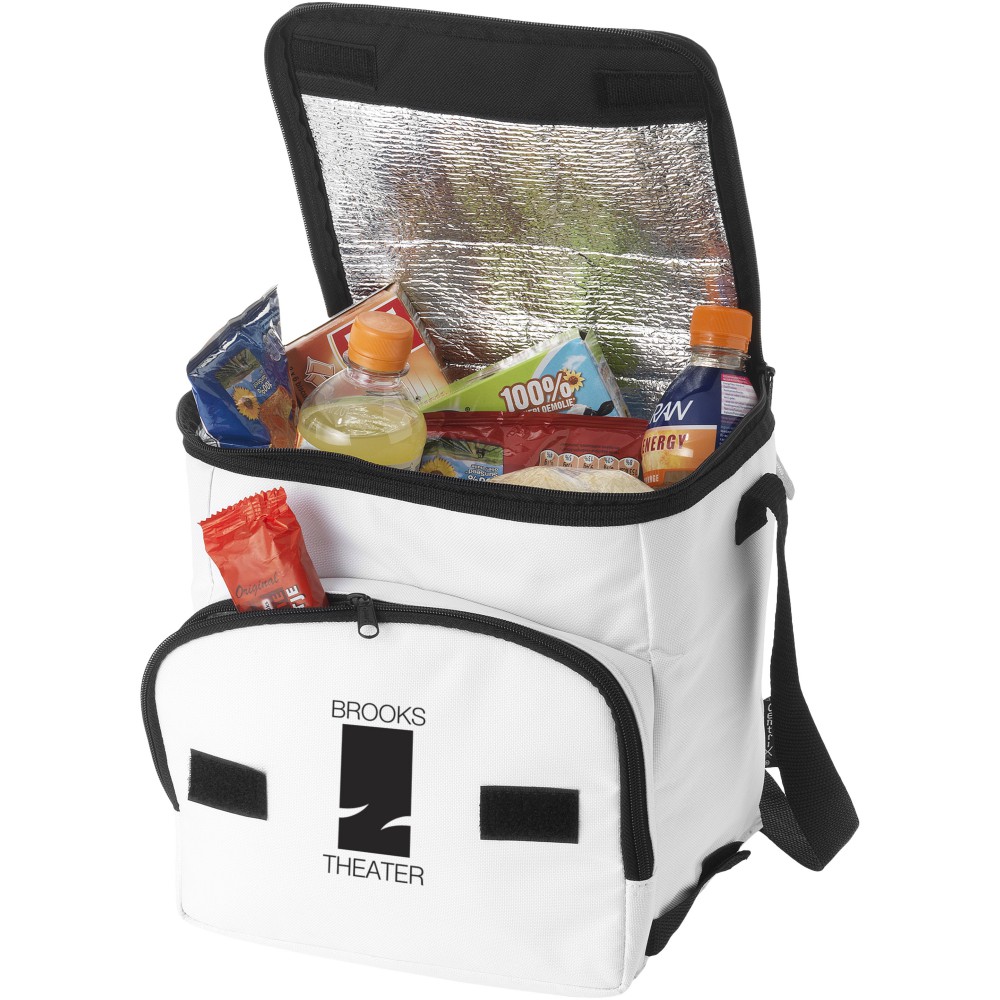 Összehajtható hűtőtáska cipzáras fő rekesszel és cipzáras elülső zsebbel. Állítható vállpánt. A hűtőtáska laposra hajtható az elülső zseben található horog és hurok segítségével. Egyéb kiegészítőt nem tartalmaz. Emblémázás: Szitanyomás