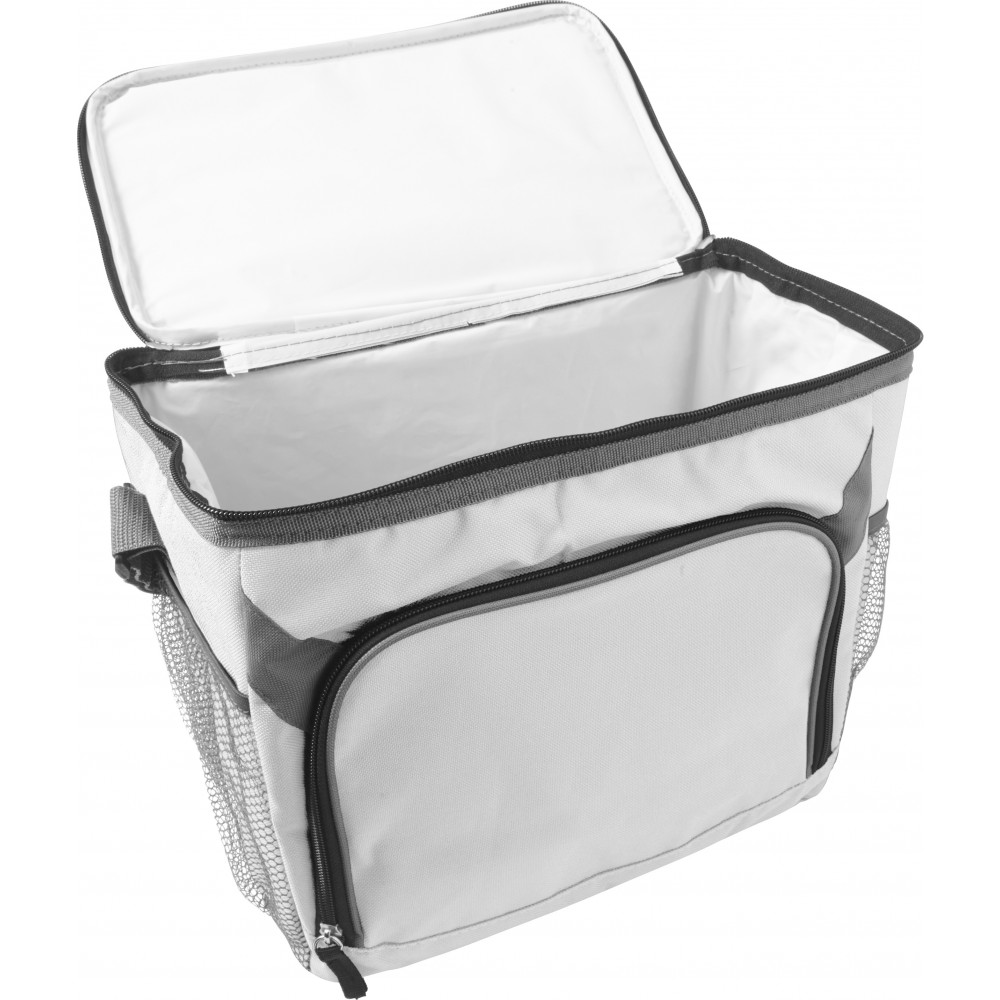 Hűtőtáska nagy cipzáros elsőzsebbel és mindkét végén hálós zsebekkel. 600D poliészter. Emblémázás: Szitanyomás