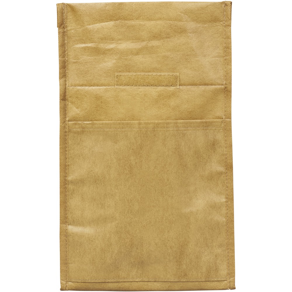Papír hatású nyomattal rendelkező hűtőtáska. Bélelt fő rekesszel és Velcro?, azaz tépőzáras záródással. Emblémázás: Szitanyomás
