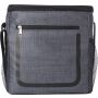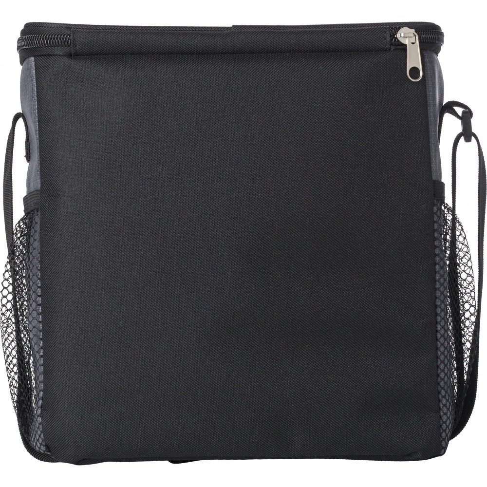 Hűtőtáska cipzáras elsőzsebbel és hálós oldalsó rekeszekkel. A belső rész fehér szigetelő fóliával van bélelve. A táska állítható vállpánttal rendelkezik. PE, PU műanyag. Emblémázás: Szitanyomás