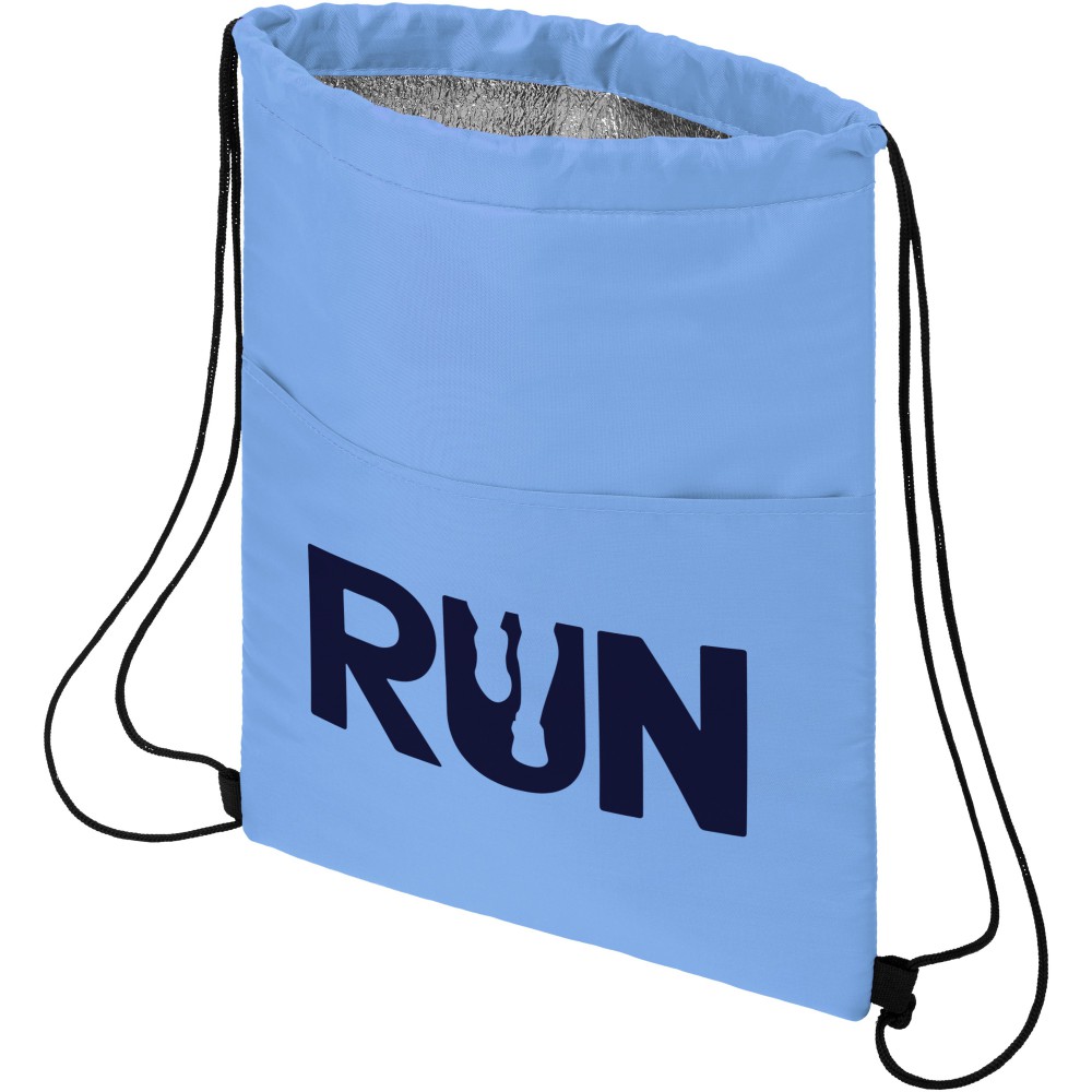 Hátizsák és hűtőtáska fekete húzózsinórral 12 doboz számára. Teherbírás 5 kg-ig. 210D poliészter. Emblémázás: Szitanyomás