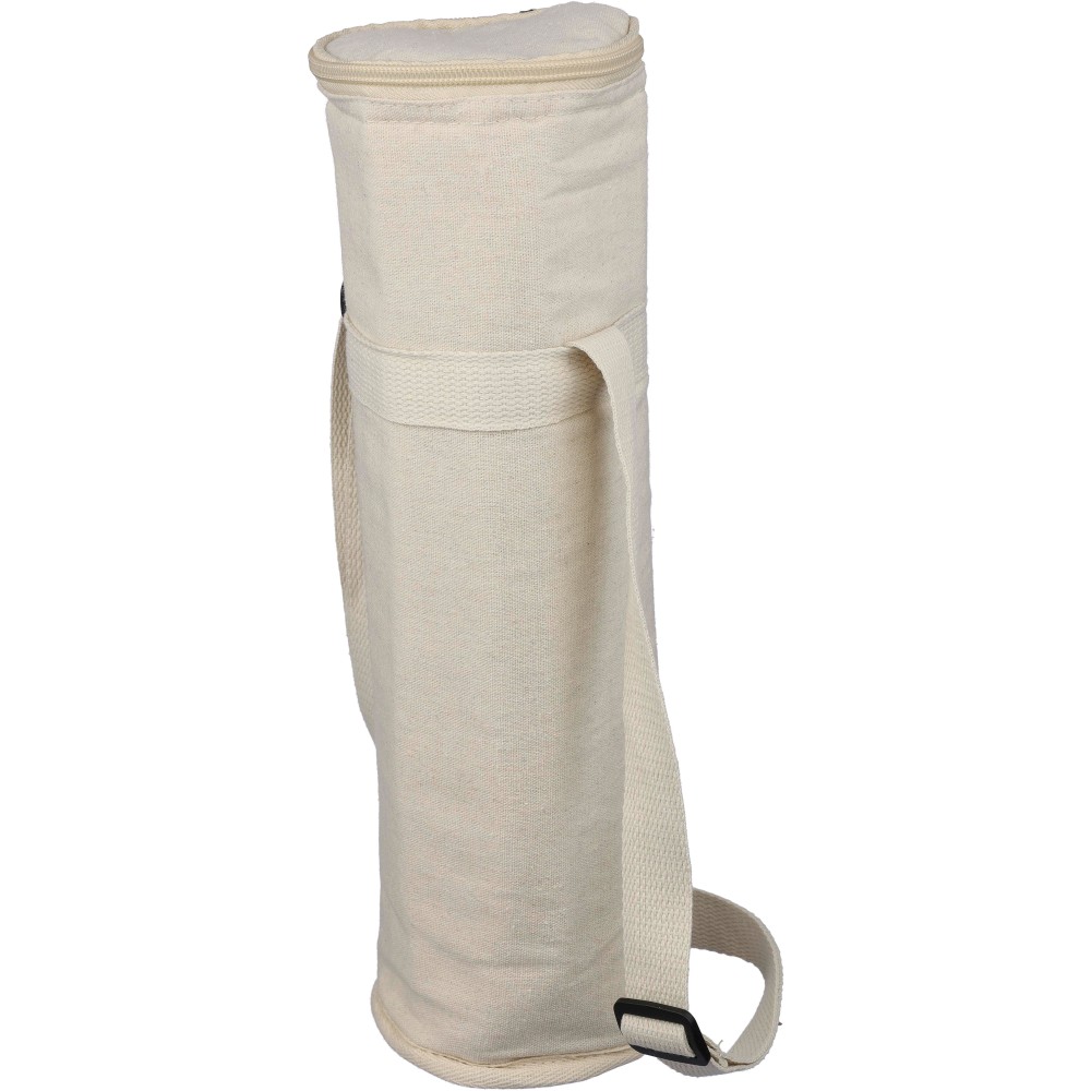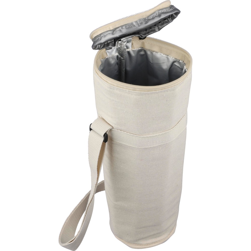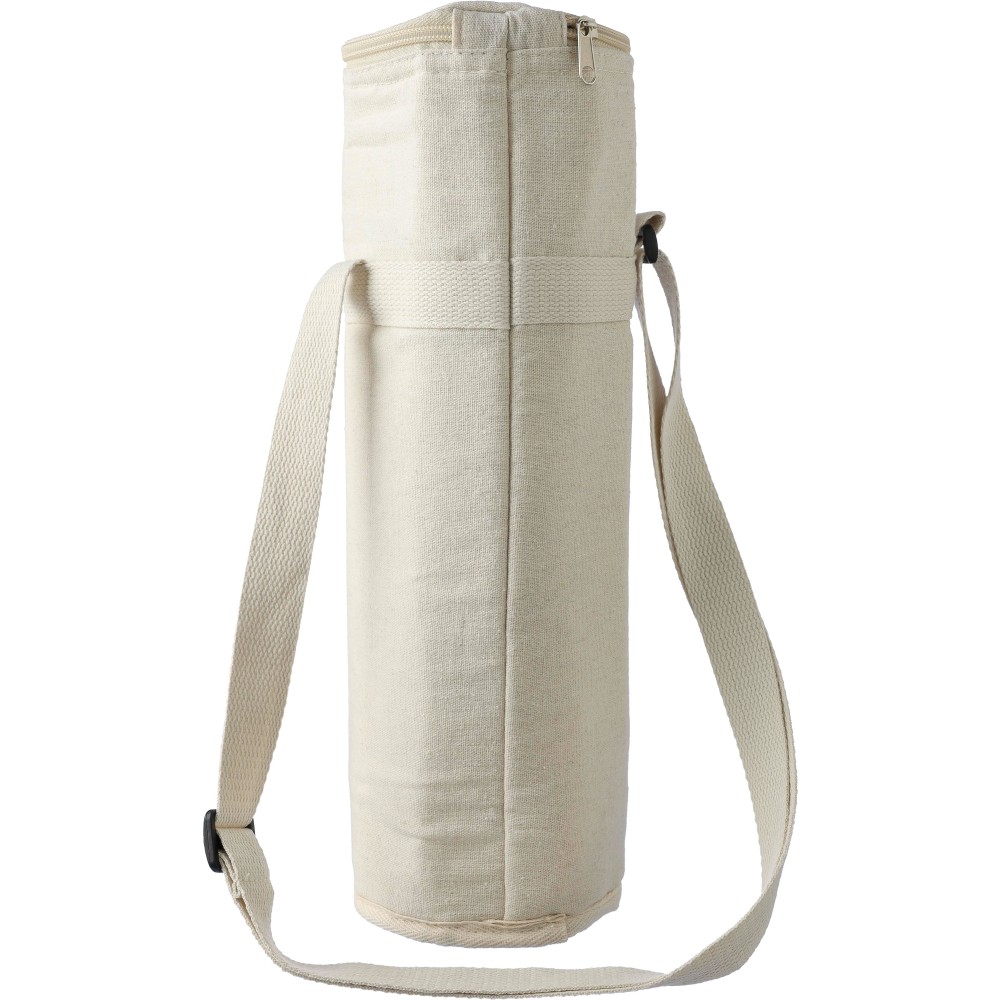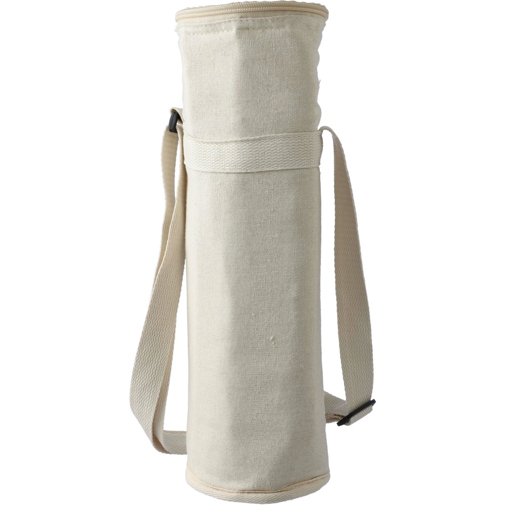 Palackhűtő táska cipzáras záródással, belsejében 2 mm EPE és 12C PEVA béléssel. Hosszú, állítható hordozópánttal. Kapacitás: 1,5 literes palack. Az oldalon újrahasznosított pamut anyagra utaló címkével. Anyaga: újrahasznosított pamut 270 g/m2. Emblémázás: Szitanyomás