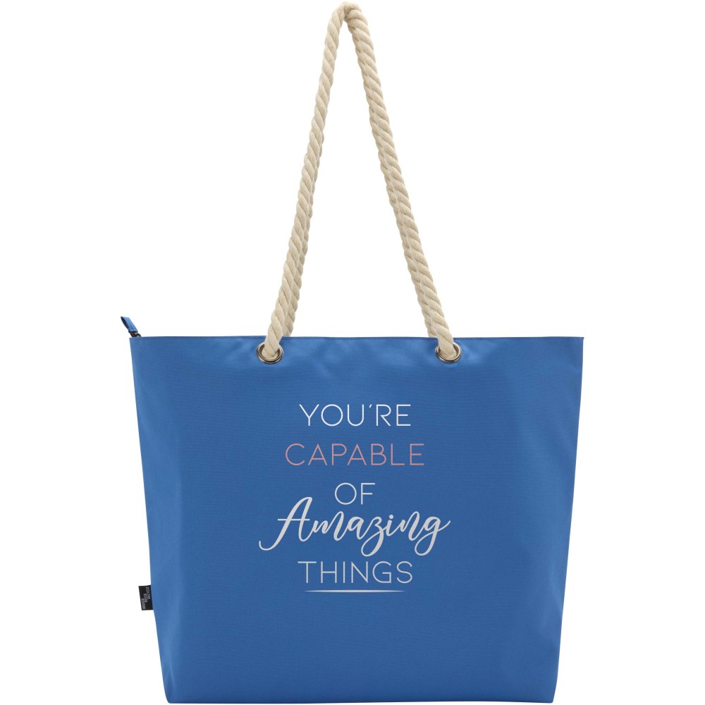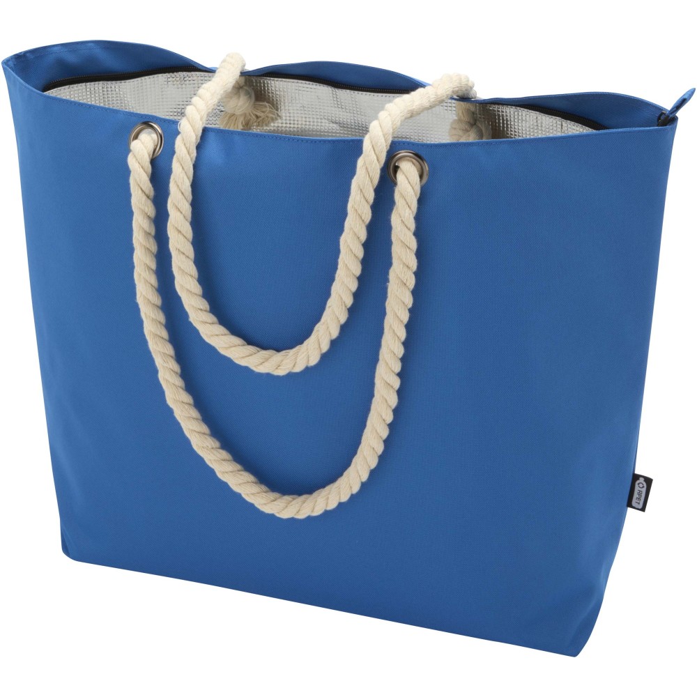 A Panama hűtőtáska GRS tanúsítvánnyal rendelkező újrahasznosított poliészterből készült, és nagy, cipzáras főrekesszel van ellátva. Kiváló minőségű alumínium fóliával bélelt belső résszel és pamut fülekből áll. Ideális bevásárláshoz, strandoláshoz vagy egy parkbéli kiránduláshoz. Űrtartalma: 23 liter. Teherbírás: akár 10 kg. PVC-mentes. Emblémázás: Szitanyomás