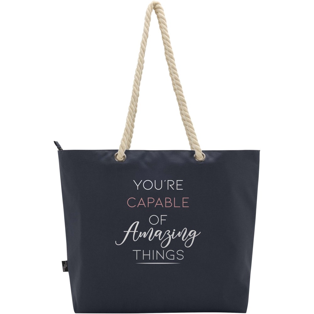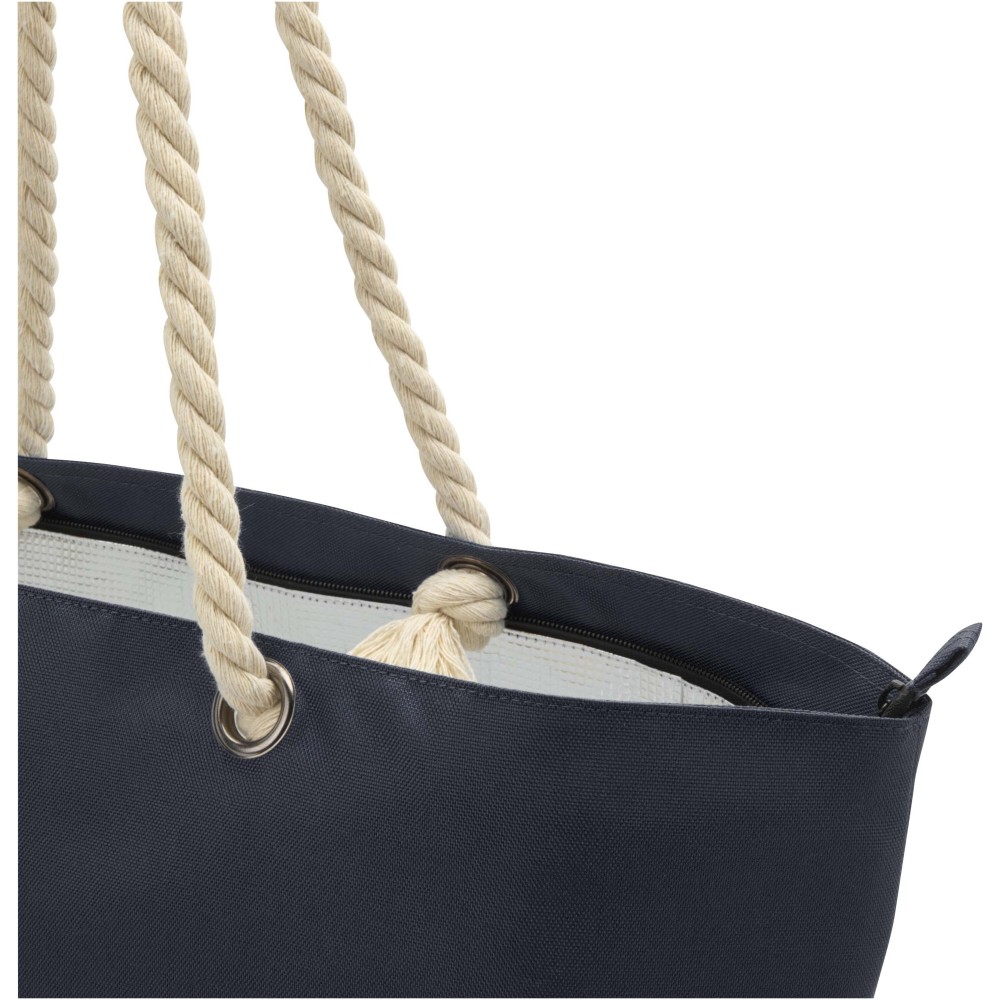A Panama hűtőtáska GRS tanúsítvánnyal rendelkező újrahasznosított poliészterből készült, és nagy, cipzáras főrekesszel van ellátva. Kiváló minőségű alumínium fóliával bélelt belső résszel és pamut fülekből áll. Ideális bevásárláshoz, strandoláshoz vagy egy parkbéli kiránduláshoz. Űrtartalma: 23 liter. Teherbírás: akár 10 kg. PVC-mentes. Emblémázás: Szitanyomás