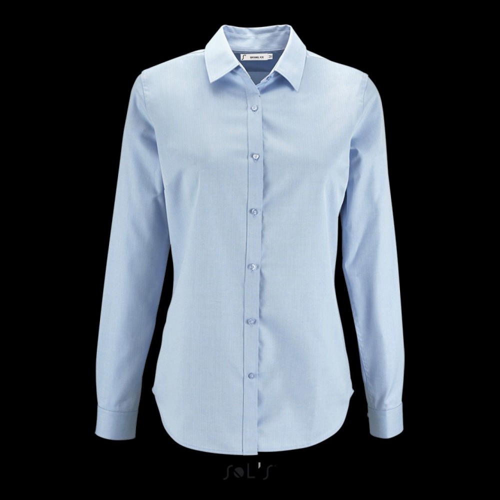 82% pamut és 18% poliészter anyag. Hosszúujjú, karcsúsított női ing halszálkamintás, texturált mintázattal. Egygombos, allítható kézelő. 125 g/m2. XS-2XL. Emblémázás: Hímzés
