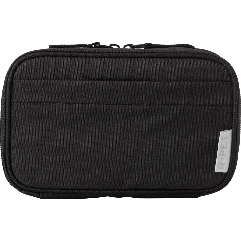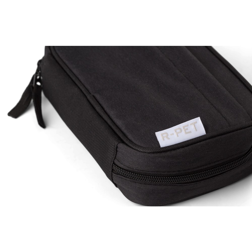 RPET 300D poliészterből készült utazótáska. Egy rekesz több zsebbel a kábelek és iratok számára. Tépőzárral záródó elülső zsebbel. RPET címkével. Emblémázás: Szitanyomás