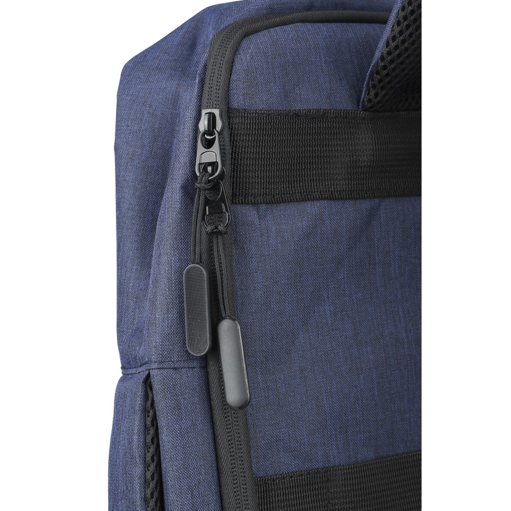 Laptophátizsák 300D rPET poliészter anyagból, 210D rPET béléssel. Egy nagy cipzáras rekesszel, számtalan belső zsebbel, tépőzáras laptoptartó zsebbel 15"-es laptop számára és 12 literes űrtartalommal. Megerősített, szellőző hátrésszel, állítható vállpánttal, oldalsó hordozófüllel és gurulóstáskára való felhelyezésre alkalmas pánttal. Teherbíró képesség: 10 kg. Emblémázás: Szitanyomás
