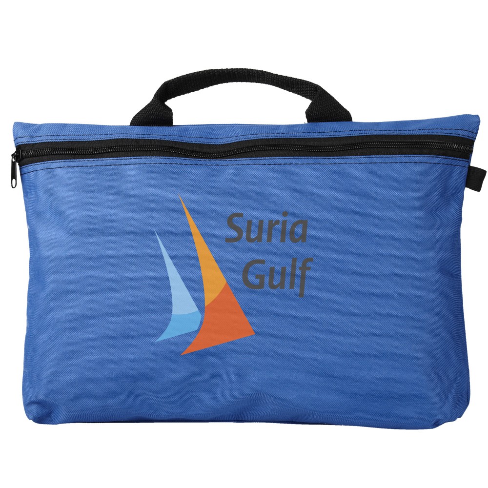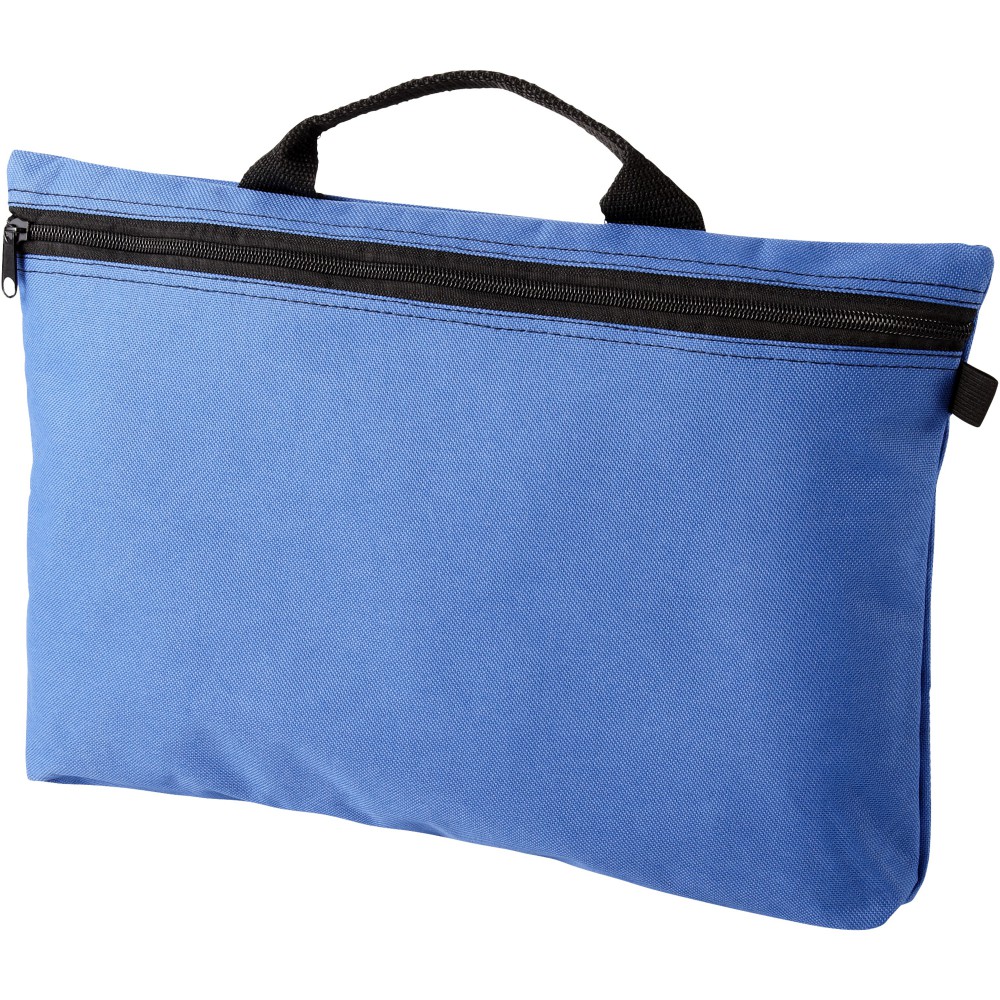Konferenciatáska erős füllel, cipzárral zárható, tolltartó hurkokkal a táska belsejében és kívül is. Ideális A4-es méretű kiadványokhoz. 600D poliészter. Emblémázás: Szitanyomás