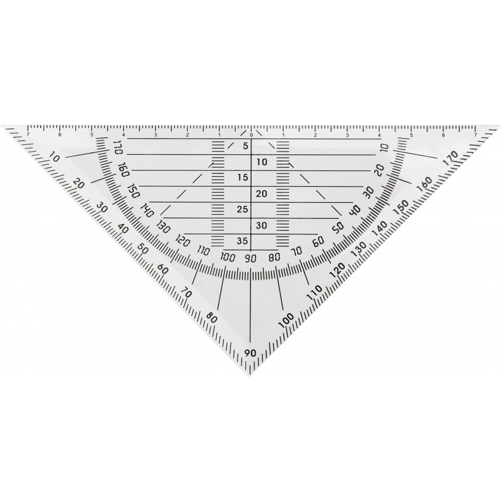 Háromszögű vonalzó és szögmérő, átlátszó