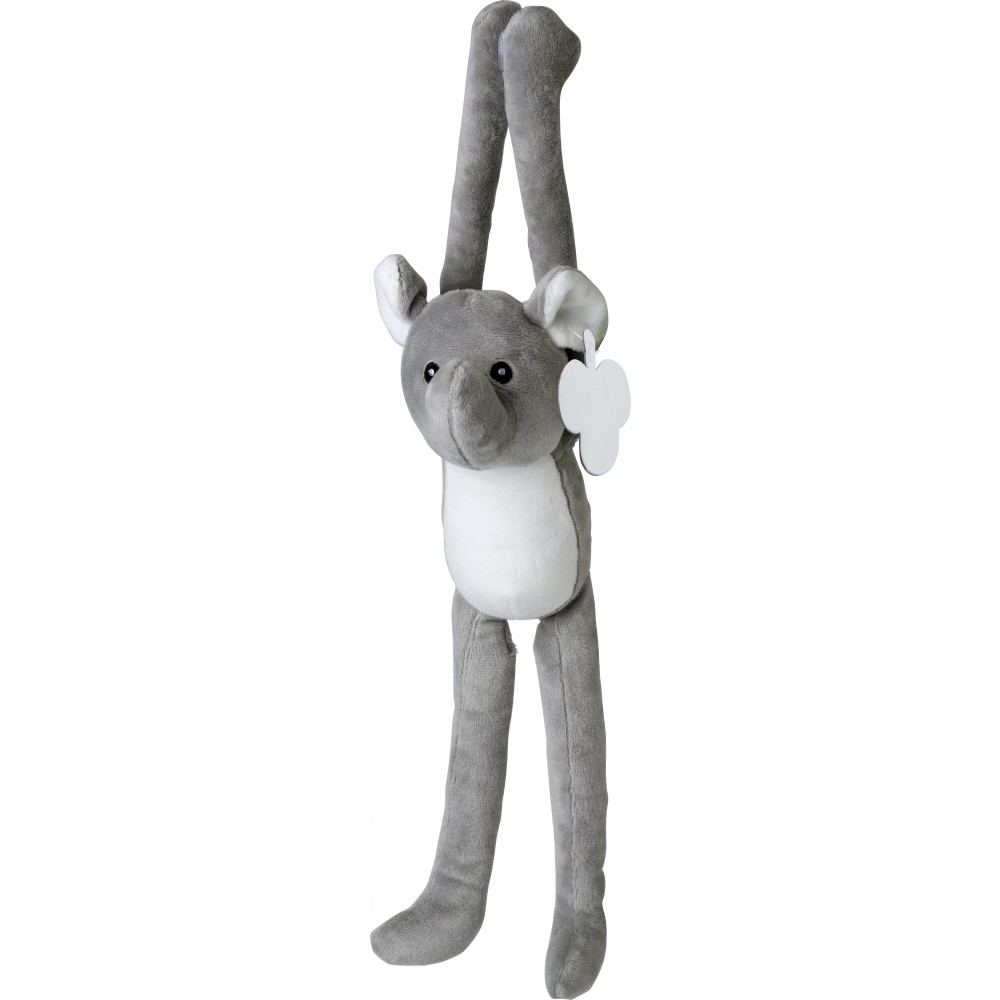Plüss elefánt hosszú kezekkel és lábakkal, melyek végén tépőzár található. A tépőzárak segítségével textil felületeken könnyen rögzíthető. Hímzett szemek, emblémázható címke a fülben. Emblémázás: Tamponnyomás