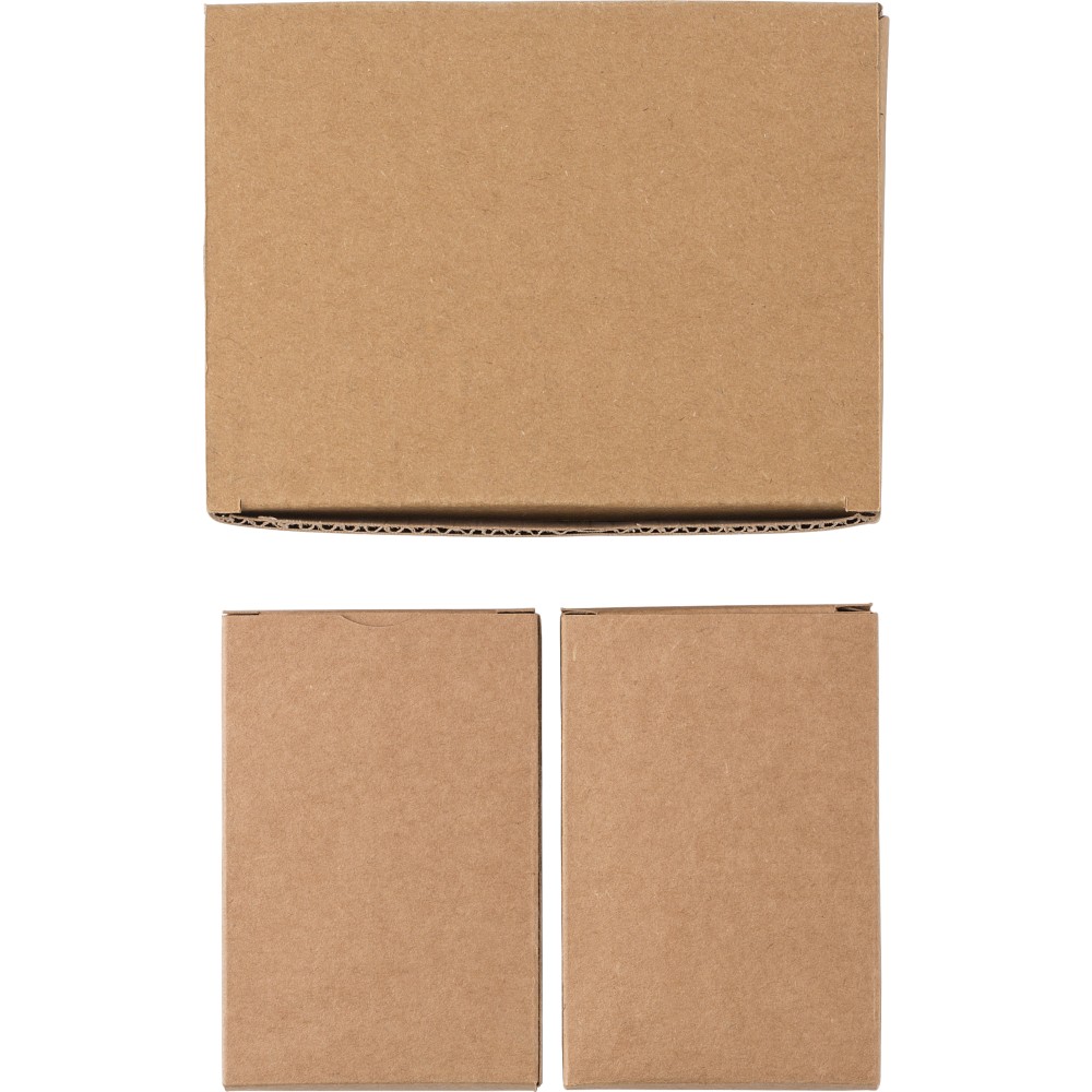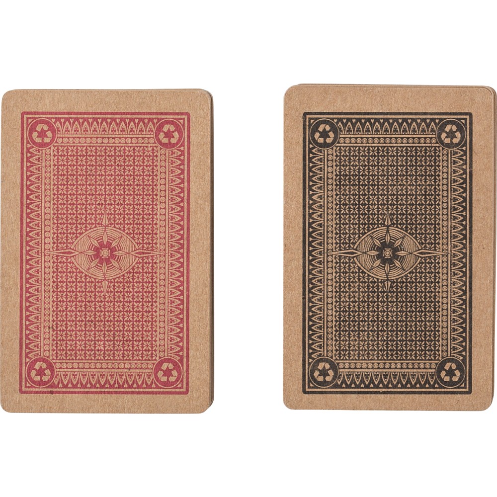 Újrahasznosított kartonból készült kártyapakli, két darabos készlet. Készletenként 54 kártya (52 kártya + 2 joker kártya). Paklinként kraftpapír dobozba csomagolva, és a két pakli együtt egy kemény dobozban. Emblémázás: Tamponnyomás