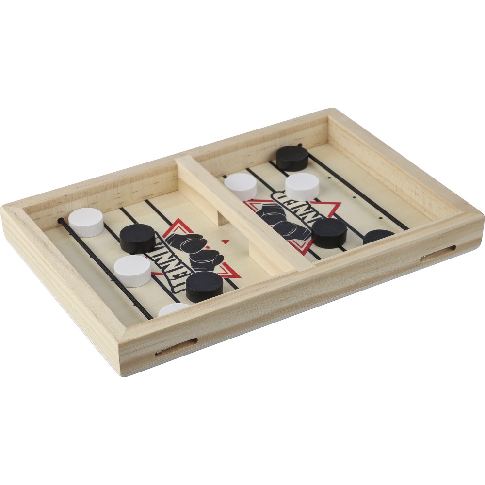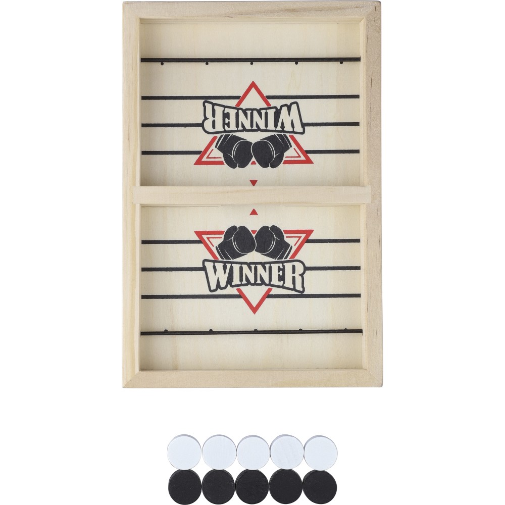 Tartalma 10 db korong (5 db fekete, 5 db fehér) és egy játékszabály. Gyorsan elsajátítható játék gyerekek és felnőttek számára. A flipperre és a gombfocira emlékeztető játék, amire sling puck néven keresve több videót találhattok. Csomagolása illusztrált barna papírdoboz. Emblémázás: Gravírozás, Tamponnyomás