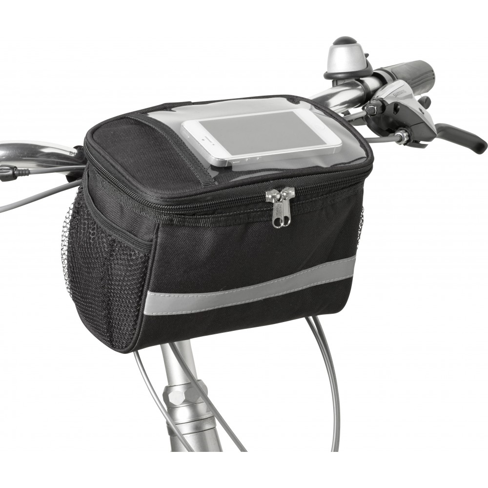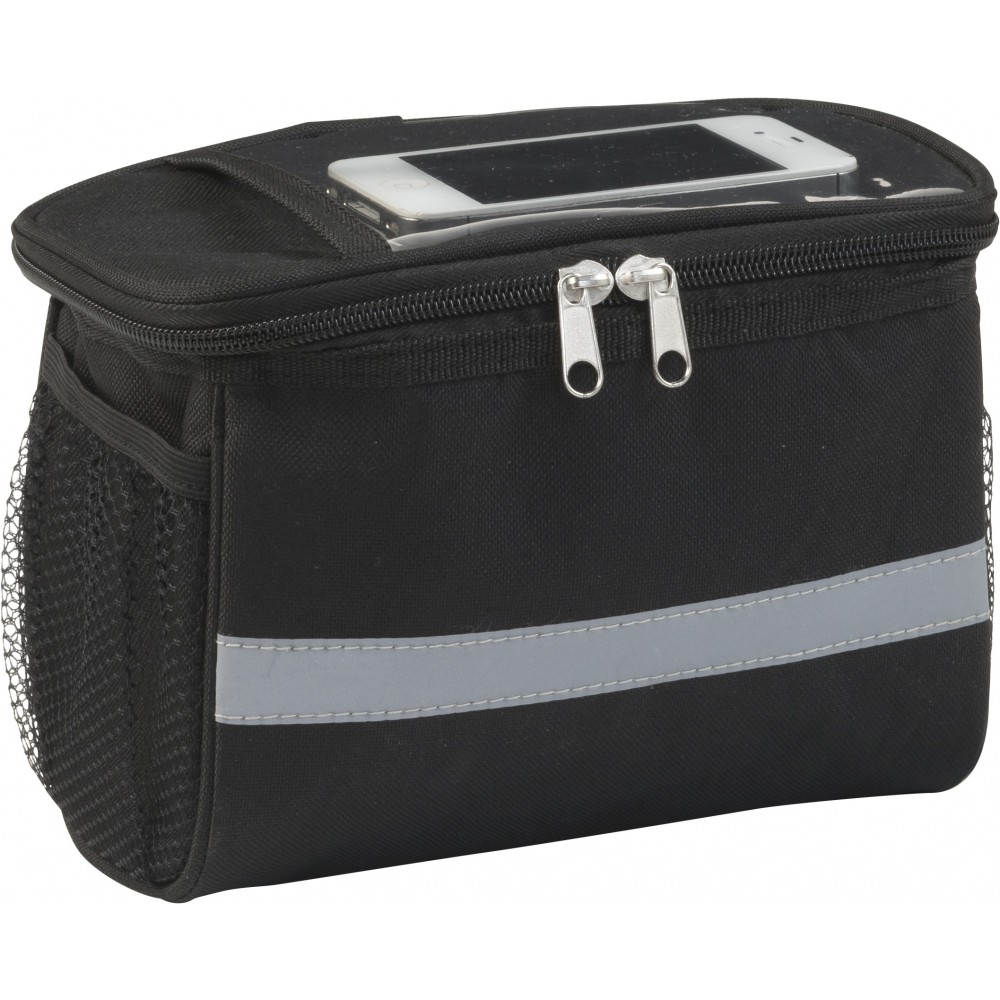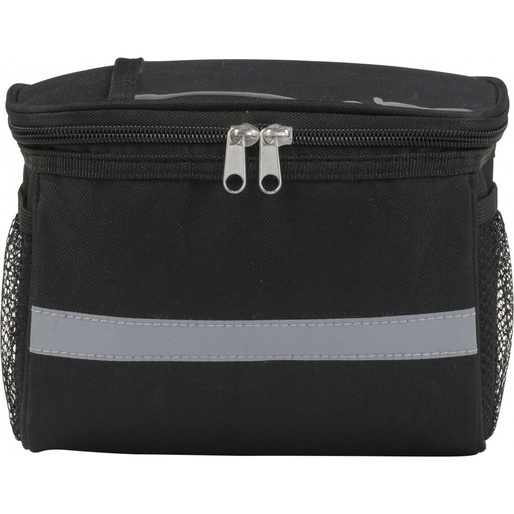Kerékpáros hűtőtáska 600D poliészterből, PEVA béléssel, a tetején PVC zsebbel. Fényvisszaverő pánttal, mindkét oldalán hálós zsebekkel és nagy, cipzáros hűtőrekesszel. Emblémázás: Szitanyomás