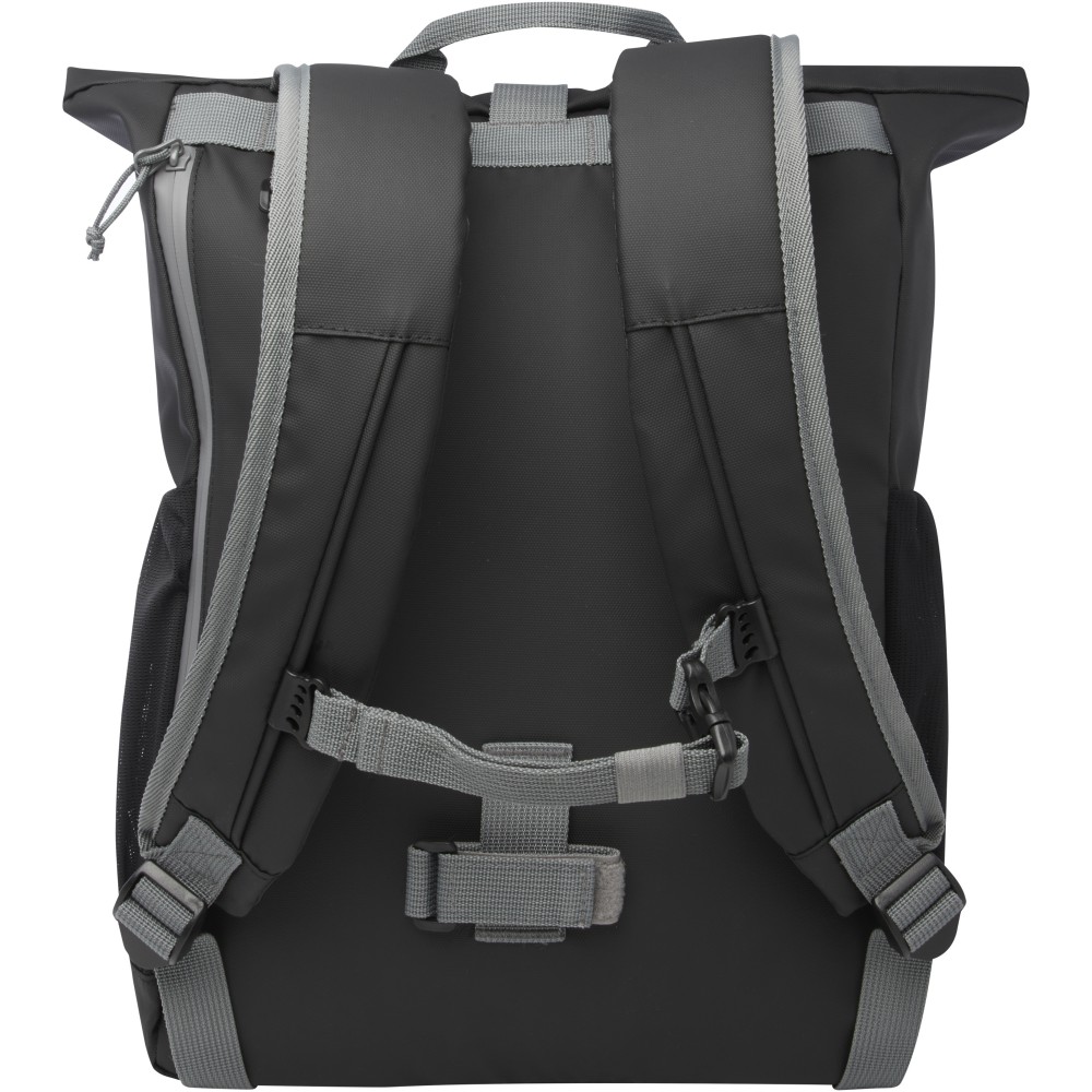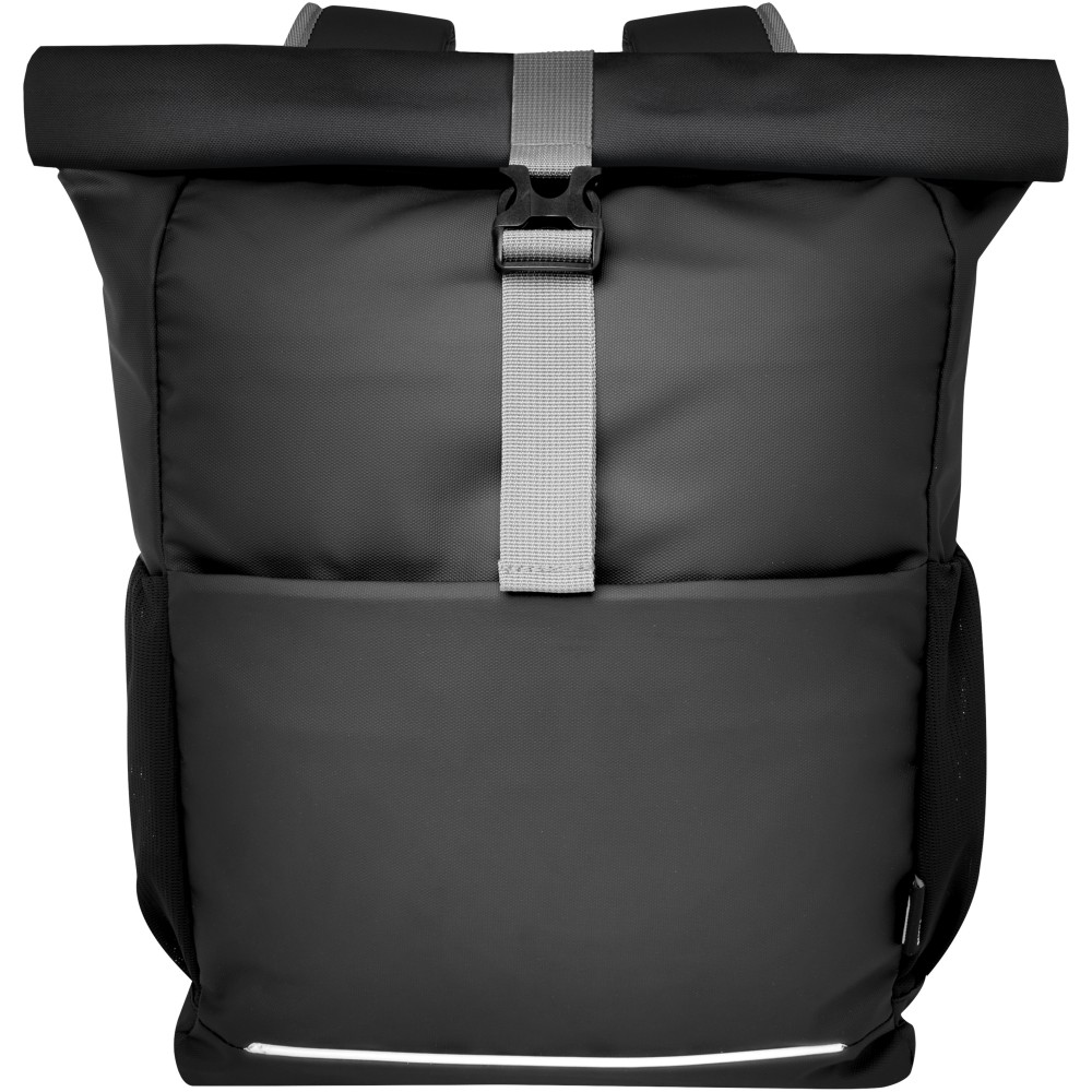 GRS tanúsítvánnyal rendelkező újrahasznosított anyagokból készült, vízálló, kerékpáros táska. Párnázott 15 -os laptop rekesszel, több zsebbel, állítható hurkokkal, valamint fényvisszaverő csíkokkal a láthatóság érdekében. Űrtartama: 20 liter. PVC-mentes. Emblémázás: Szitanyomás