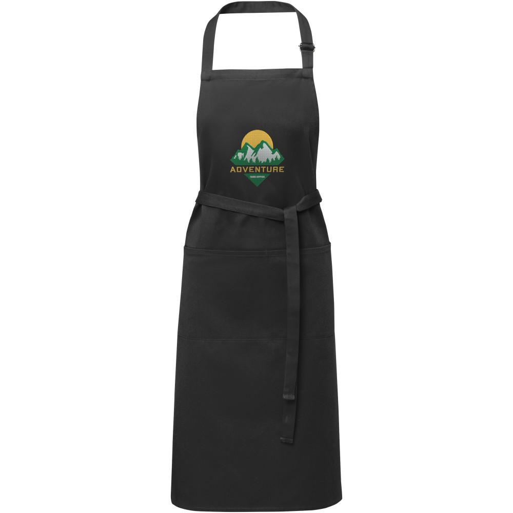 Vastag és masszív anyag, ugyanakkor puha és kényelmes viselet. A két elülső zseb gyors és egyszerű módot kínál a konyhai eszközök tárolására. A kötény nyakában csattal állítható, hátul megköthető. Nagyméretű nyomtatási lehetőség a logók megjelenítéséhez. Pamut twill 65% poliészterből és 35% pamutból, 240 g/m2. Emblémázás: Hímzés, Szitanyomás