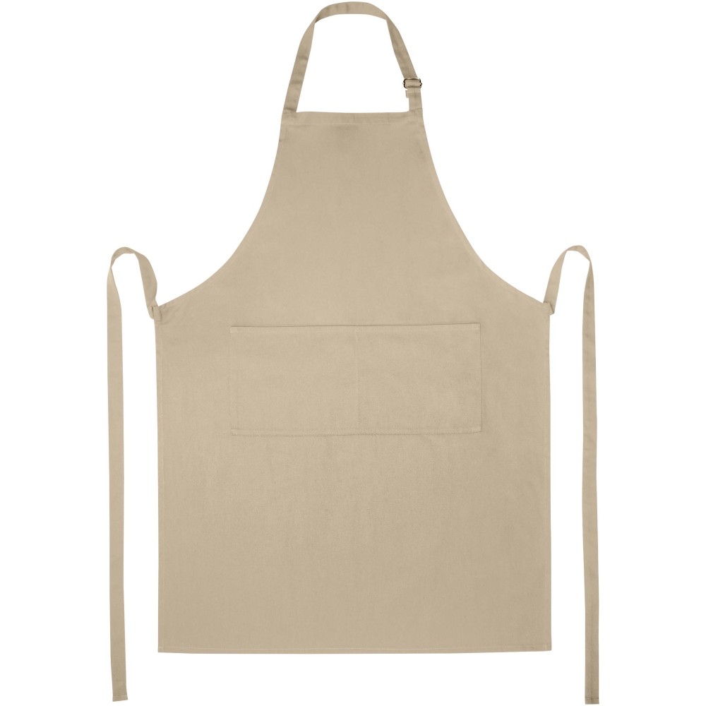 Vastag és masszív anyag, ugyanakkor puha és kényelmes viselet. A két elülső zseb gyors és egyszerű módot kínál a konyhai eszközök tárolására. A kötény nyakában csattal állítható, hátul megköthető. Nagyméretű nyomtatási lehetőség a logók megjelenítéséhez. Pamut twill 65% poliészterből és 35% pamutból, 240 g/m2. Emblémázás: Hímzés, Szitanyomás