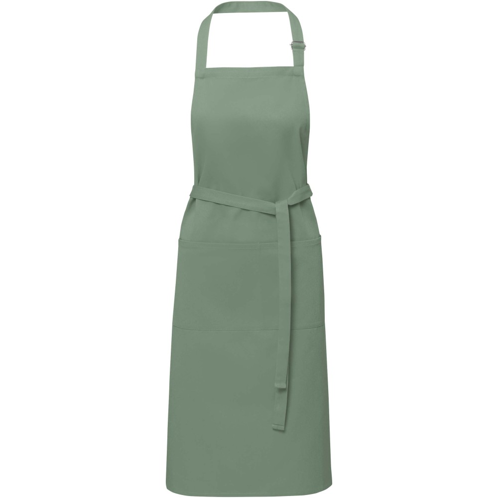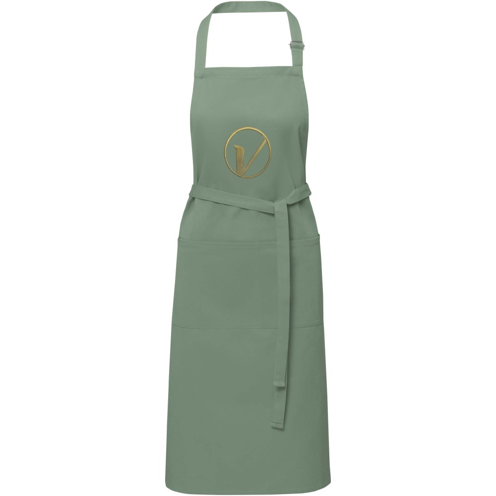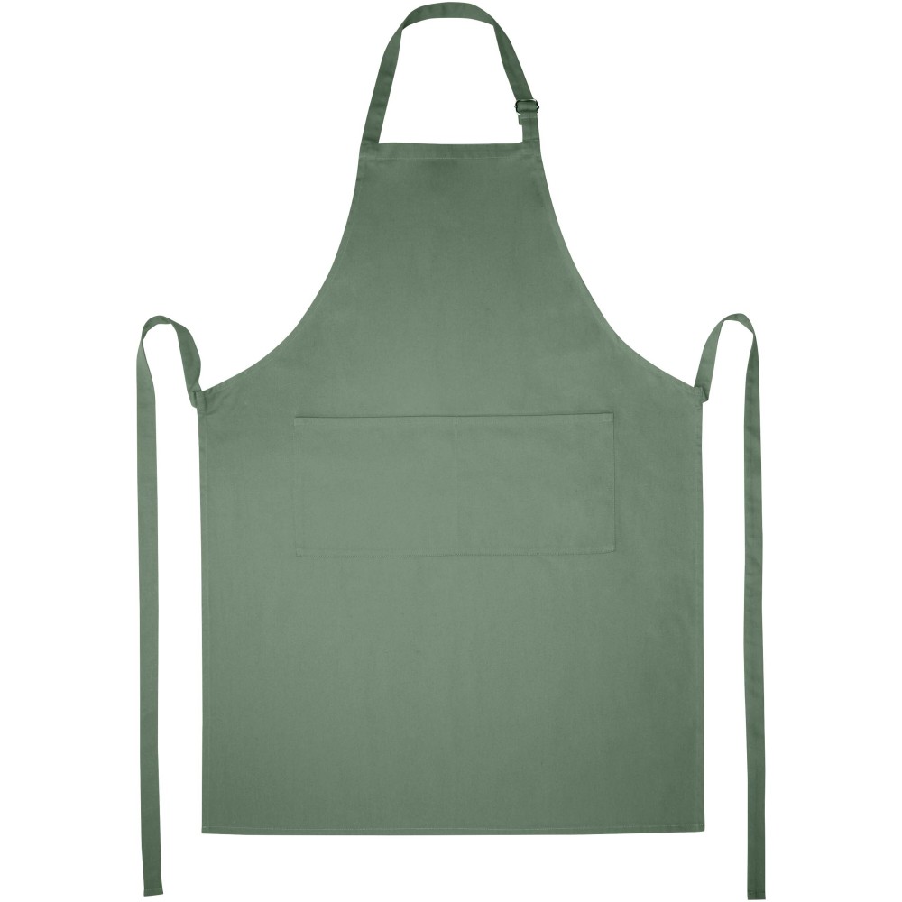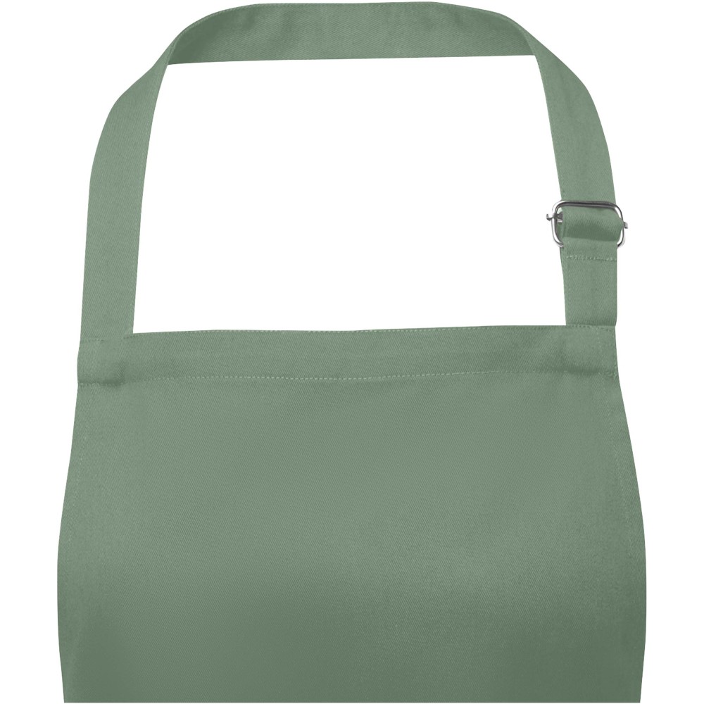 Vastag és masszív anyag, ugyanakkor puha és kényelmes viselet. A két elülső zseb gyors és egyszerű módot kínál a konyhai eszközök tárolására. A kötény nyakában csattal állítható, hátul megköthető. Nagyméretű nyomtatási lehetőség a logók megjelenítéséhez. Pamut twill 65% poliészterből és 35% pamutból, 240 g/m2. Emblémázás: Hímzés, Szitanyomás