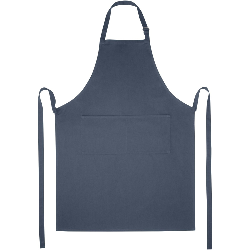 Vastag és masszív anyag, ugyanakkor puha és kényelmes viselet. A két elülső zseb gyors és egyszerű módot kínál a konyhai eszközök tárolására. A kötény nyakában csattal állítható, hátul megköthető. Nagyméretű nyomtatási lehetőség a logók megjelenítéséhez. Pamut twill 65% poliészterből és 35% pamutból, 240 g/m2. Emblémázás: Hímzés, Szitanyomás